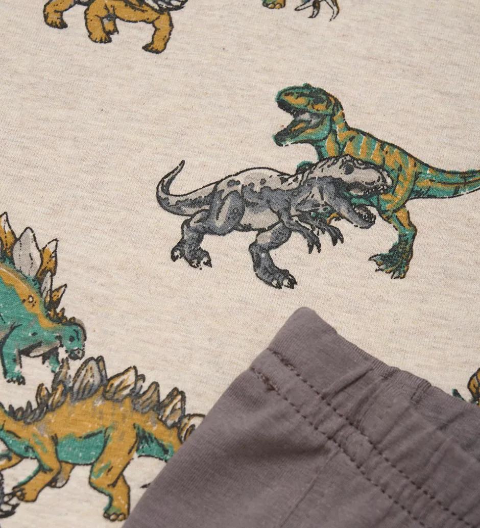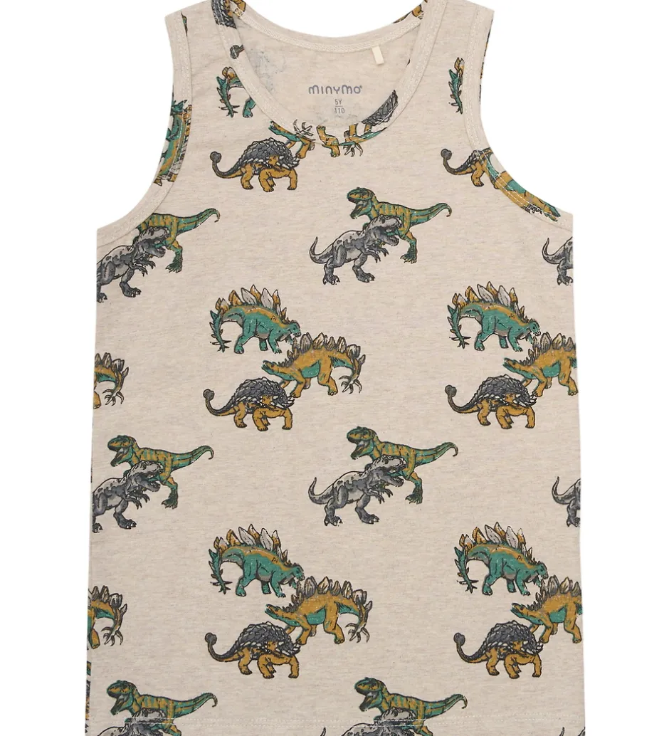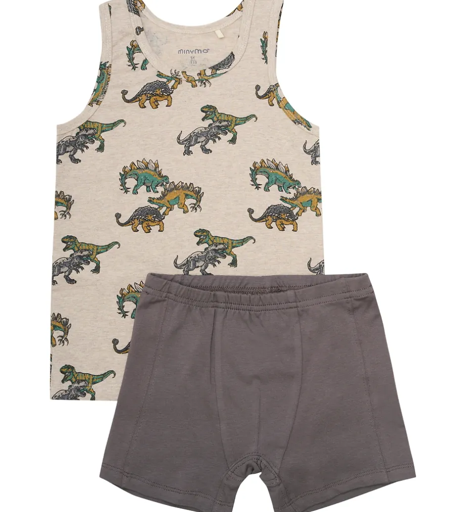 Flot Minymo undertøj med en ærmeløs undertrøje i beige med farverige dinosaurprint. De tilhørende boksershorts er i en stilfuld gråbrun nuance. Minymo sæt skaber en sjov og komfortabel stil til hverdagens eventyr.