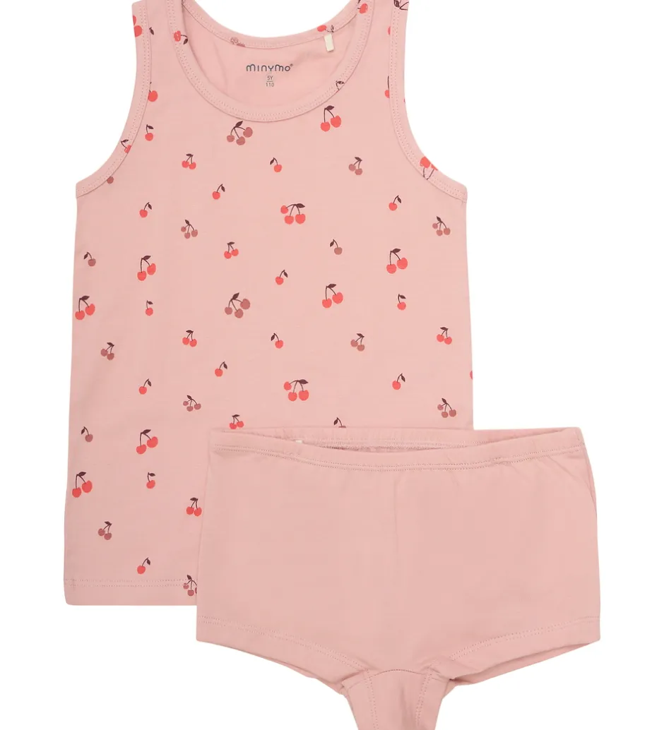 Charmerende Minymo undertøj med en top i lyserød dekoreret med fine kirsebærprint. Minymo toppen er uden ærmer, hvilket gør den behagelig på varme dage. Perfekt til at sætte et legende præg.