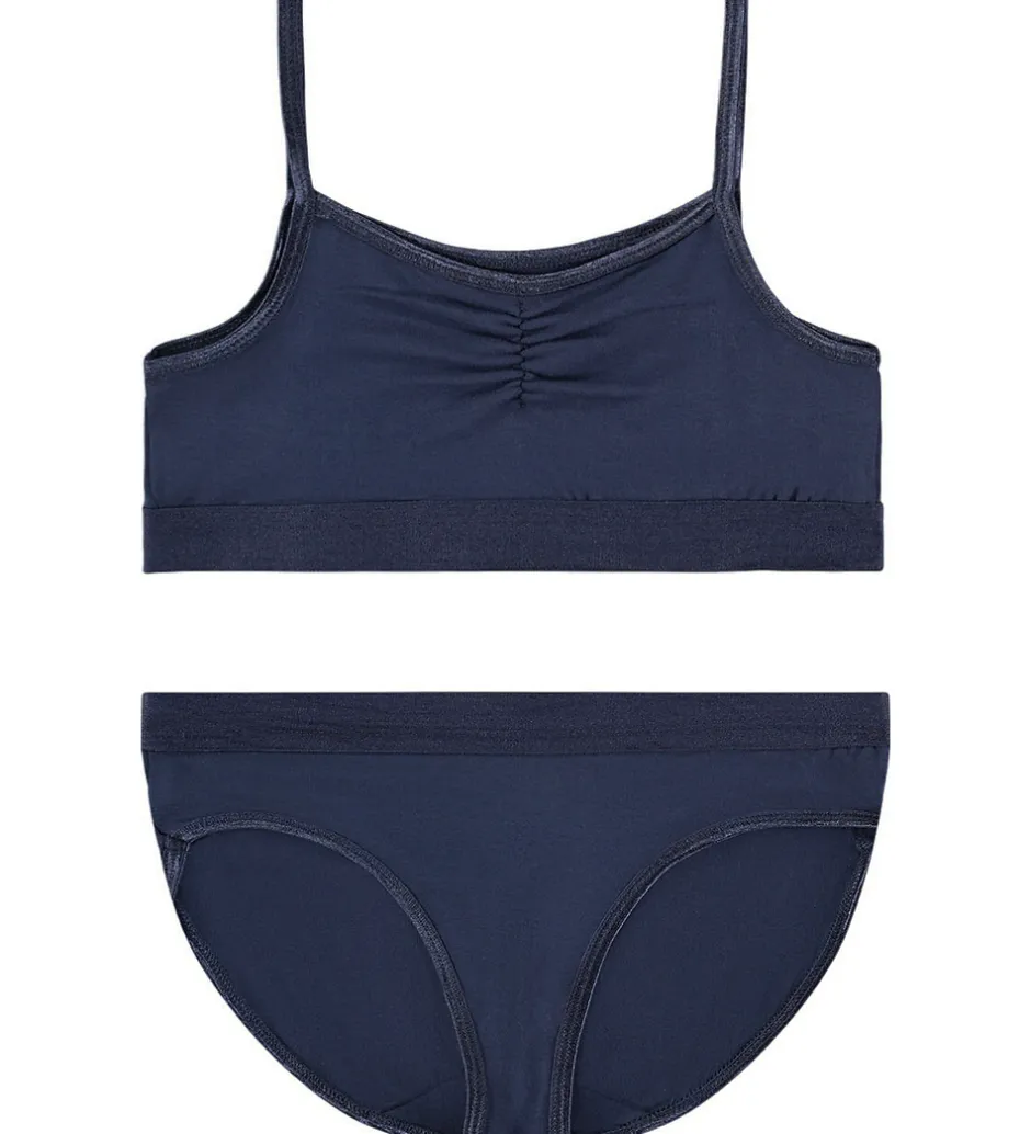 Behageligt Molo undertøj i en dyb navyblå farve. Molo sættet består af en top med smalle stropper og et par matchende trusser, hvilket giver et stilrent udtryk.
