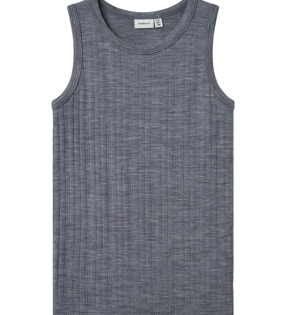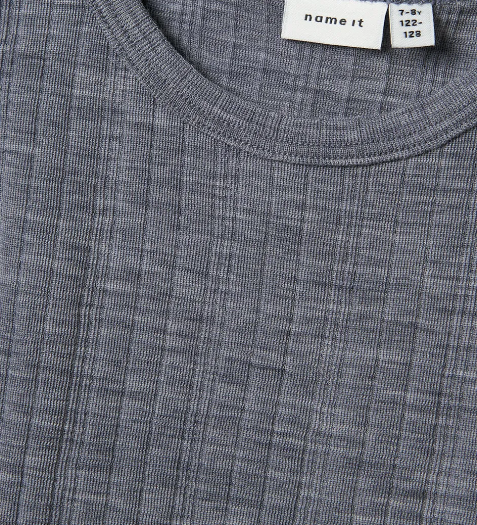 Elegant Name It undertrøje i en stilfuld grå farve. Undertrøjen har en let ribbet struktur, og den er fremstillet af blødt og åndbart merinould.
