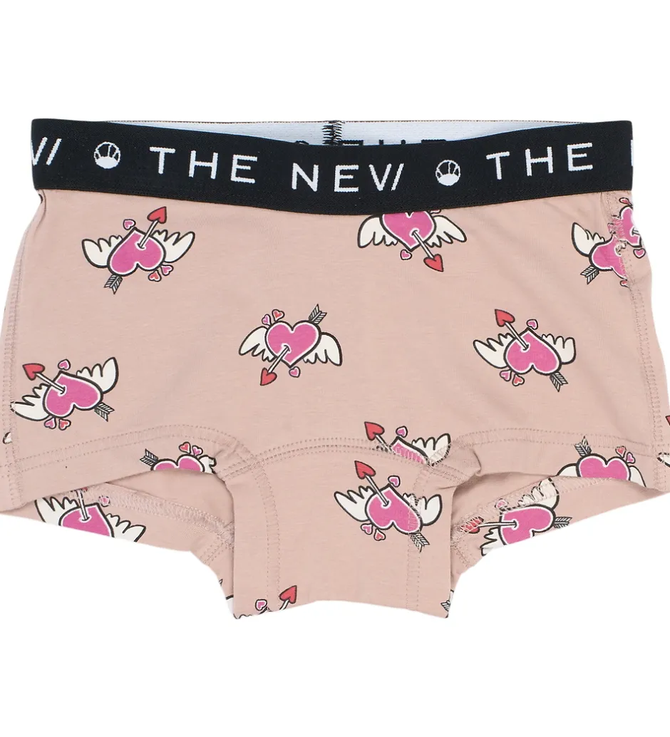 - Støvet rosa med print over det hele af et bevinget hjerte og en pil.