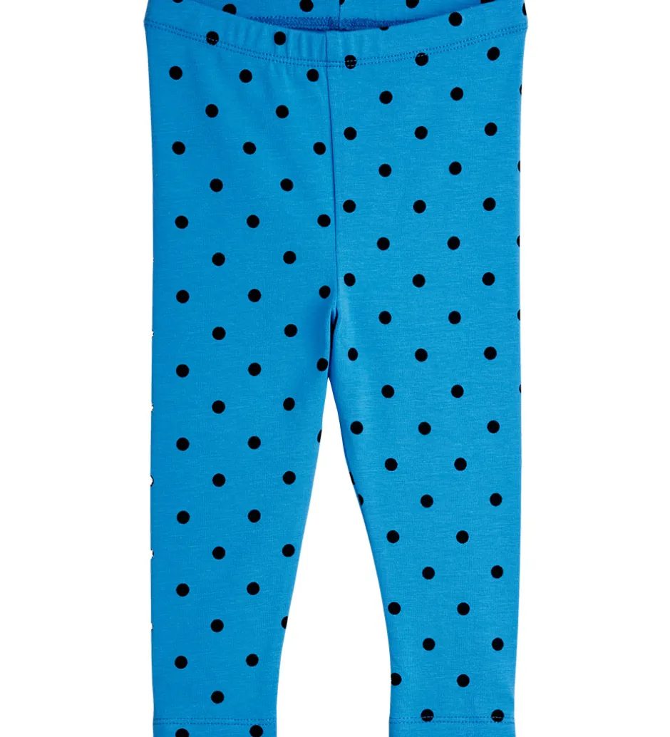 Flot Mini Rodini sæt bestående af en body med lange ærmer og et par leggings. Sættet er i en klar, blå farve dekoreret med sorte prikker. Mønstret giver et moderne udtryk og er karakteristisk for Mini Rodini.