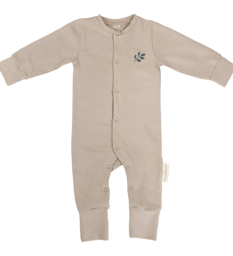 Dejlig Moonboon natdragt med babyhjelm i beige med en broderet bladgren. Moonboon natdragten med babyhjelm leveres i en fin gaveæske.