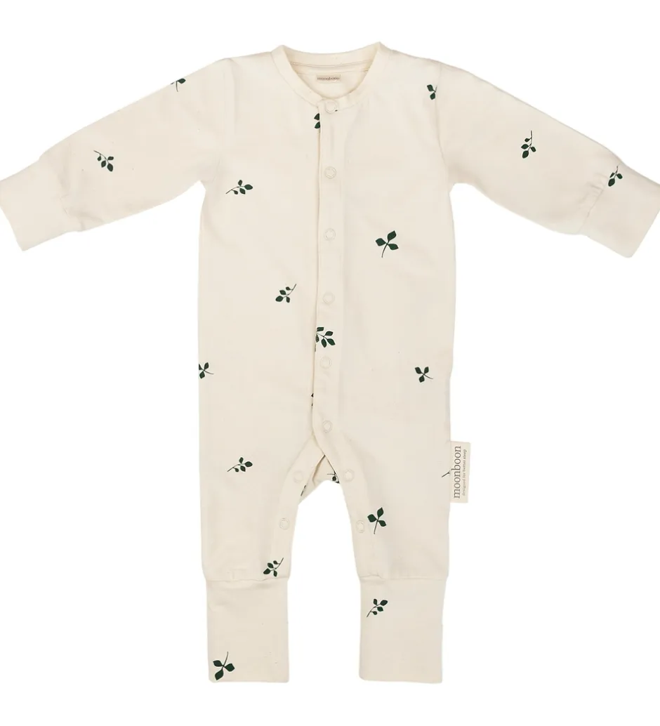 Dejlig Moonboon natdragt med babyhjelm i cremehvid med alloverprint af mørkegrønne bladgrene. Moonboon natdragten med babyhjelm leveres i en fin gaveæske og er lavet i samarbejde med H.C. Andersens Hus.
