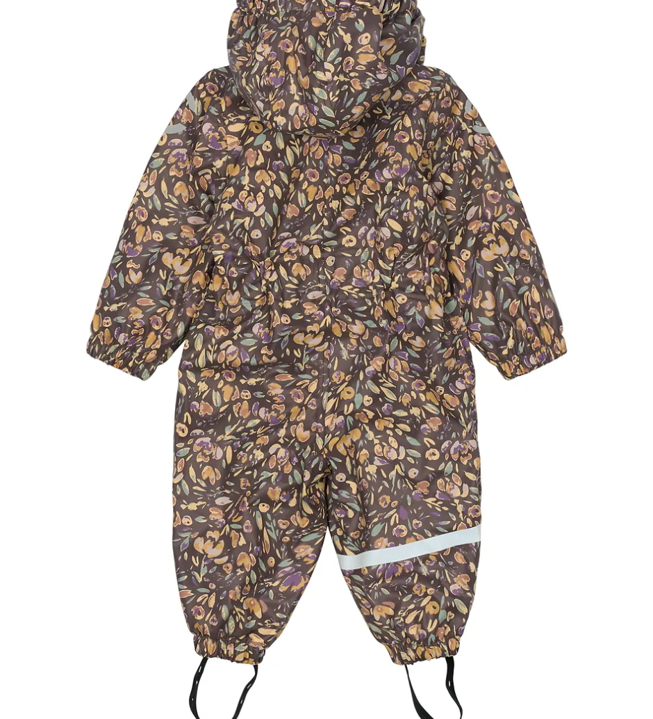 Flot Mikk-Line regndragt i støvet lilla PU med et blomsterprint i gule og orange nuancer med detaljer i lilla og mintgrøn.