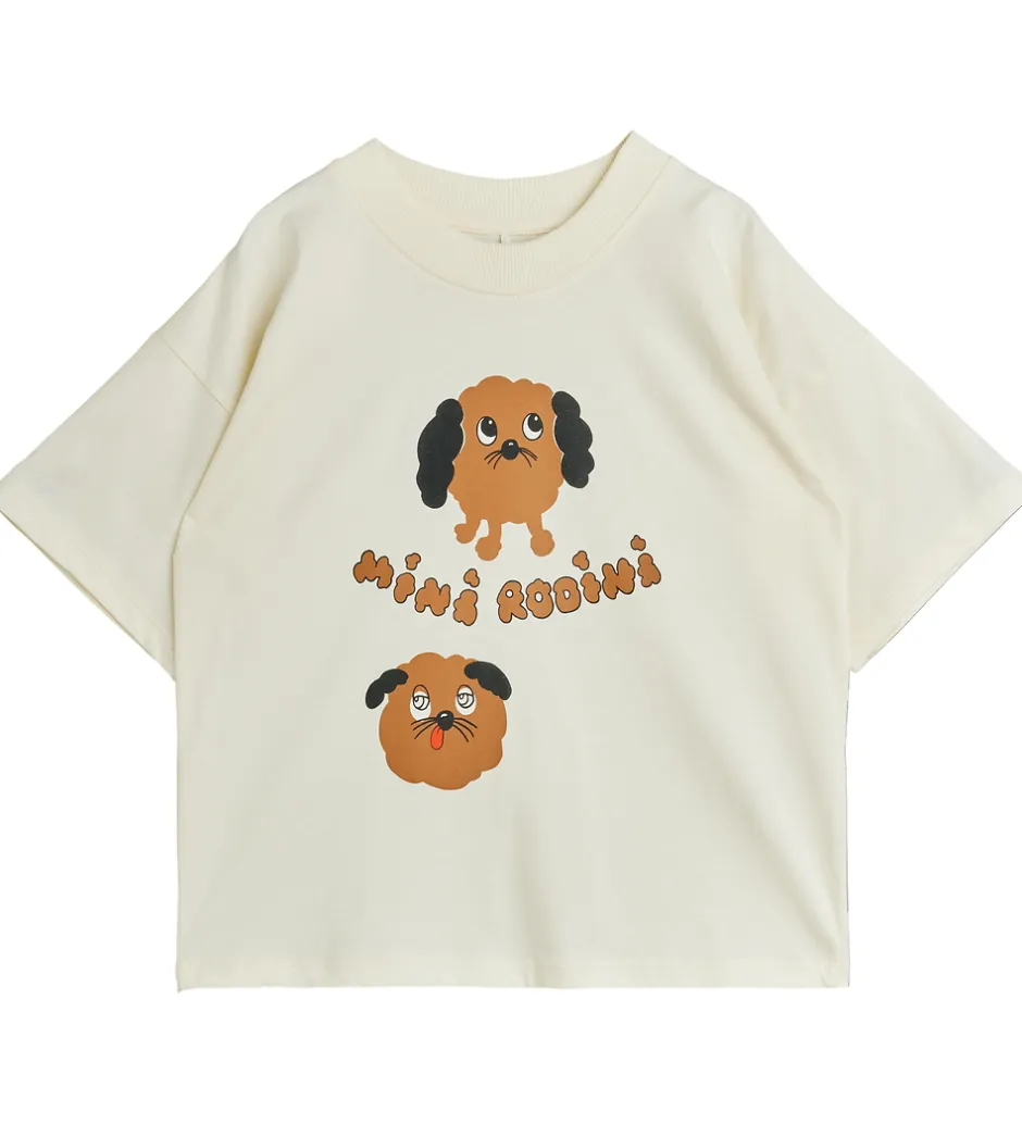 T-shirten har et tryk af to søde hundefigurer i en varm, brun farve med sorte detaljer, der giver et livligt udtryk. Mini Rodini t-shirten har en klassisk rund halsudskæring med ribkant, som fuldender det enkle design.