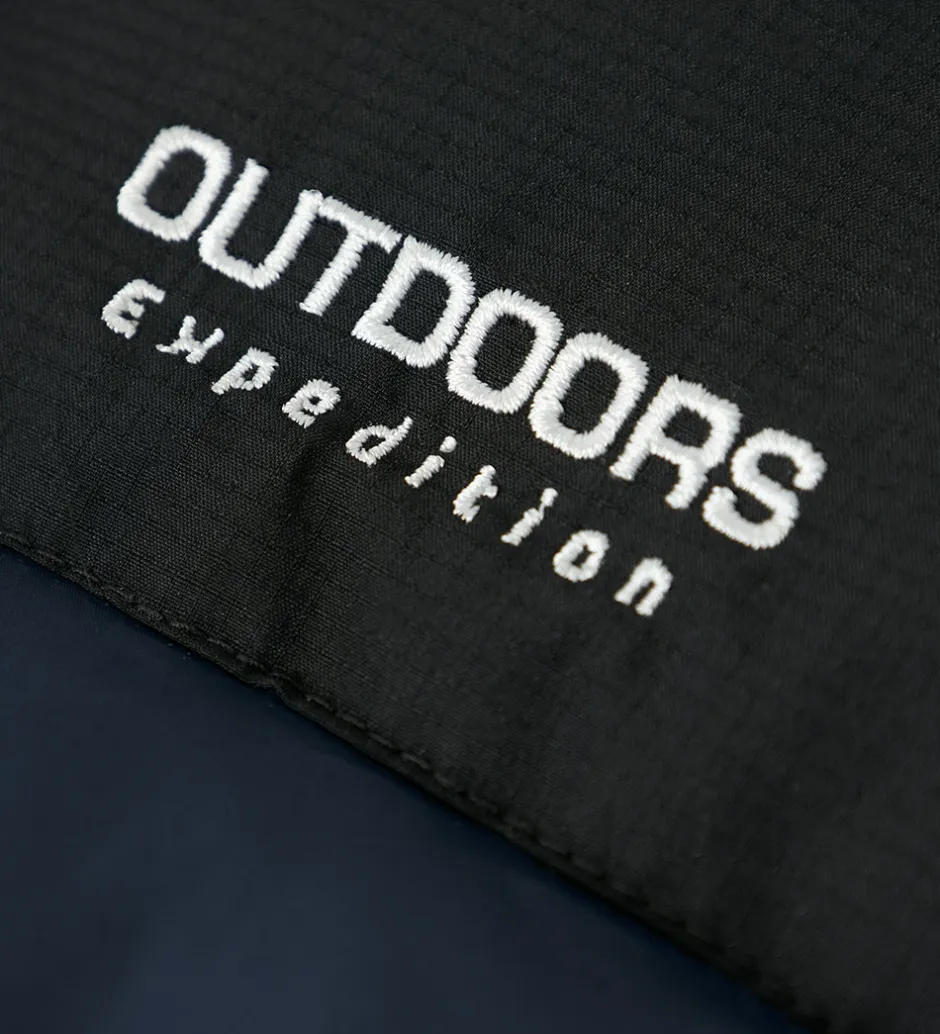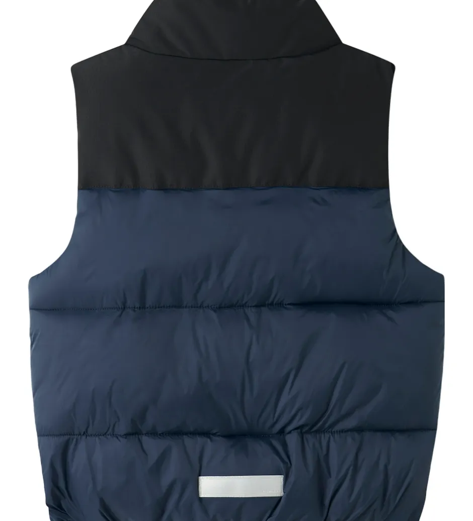 Smart Name It dynevest i en flot kombination af sort og mørkeblå med et hvidt “OUTDOORS expedition” logo på brystet.