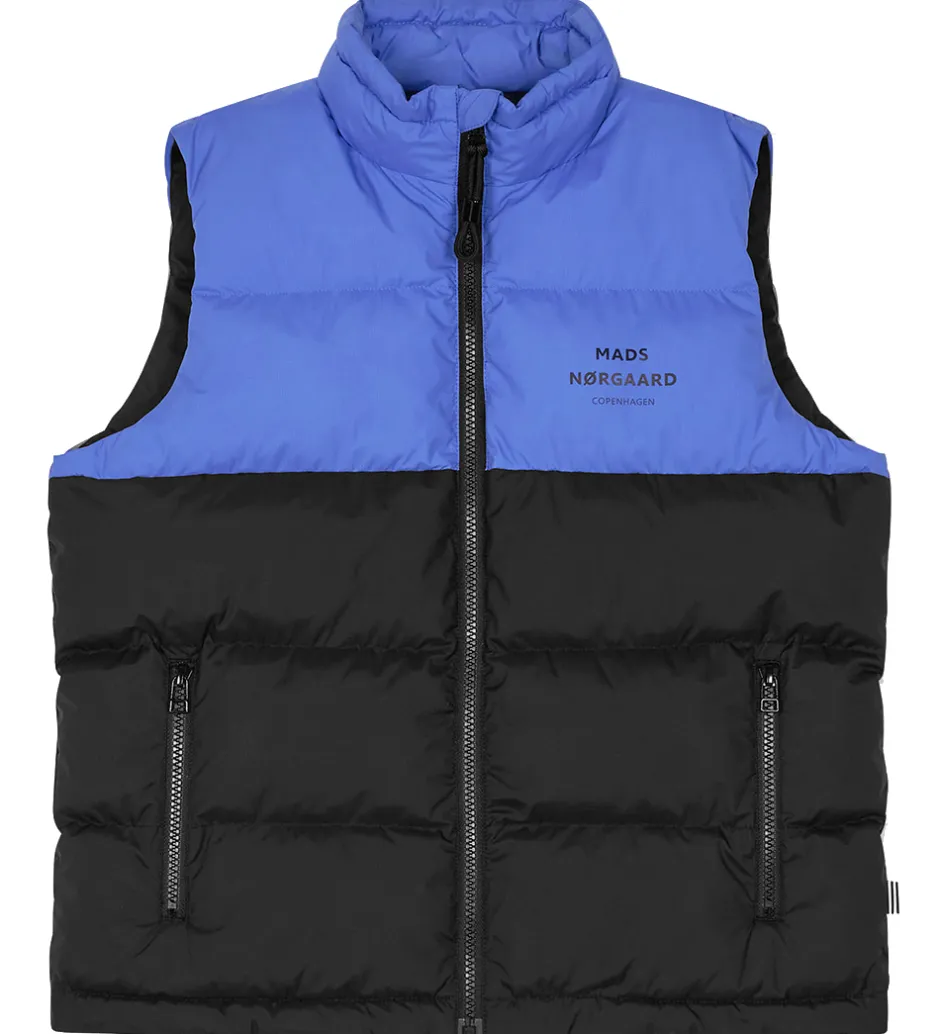 Lækker Mads Nørgaard dynevest i sort og blå med vandrette syninger, og fortil i venstre side er der et sort logoprint.