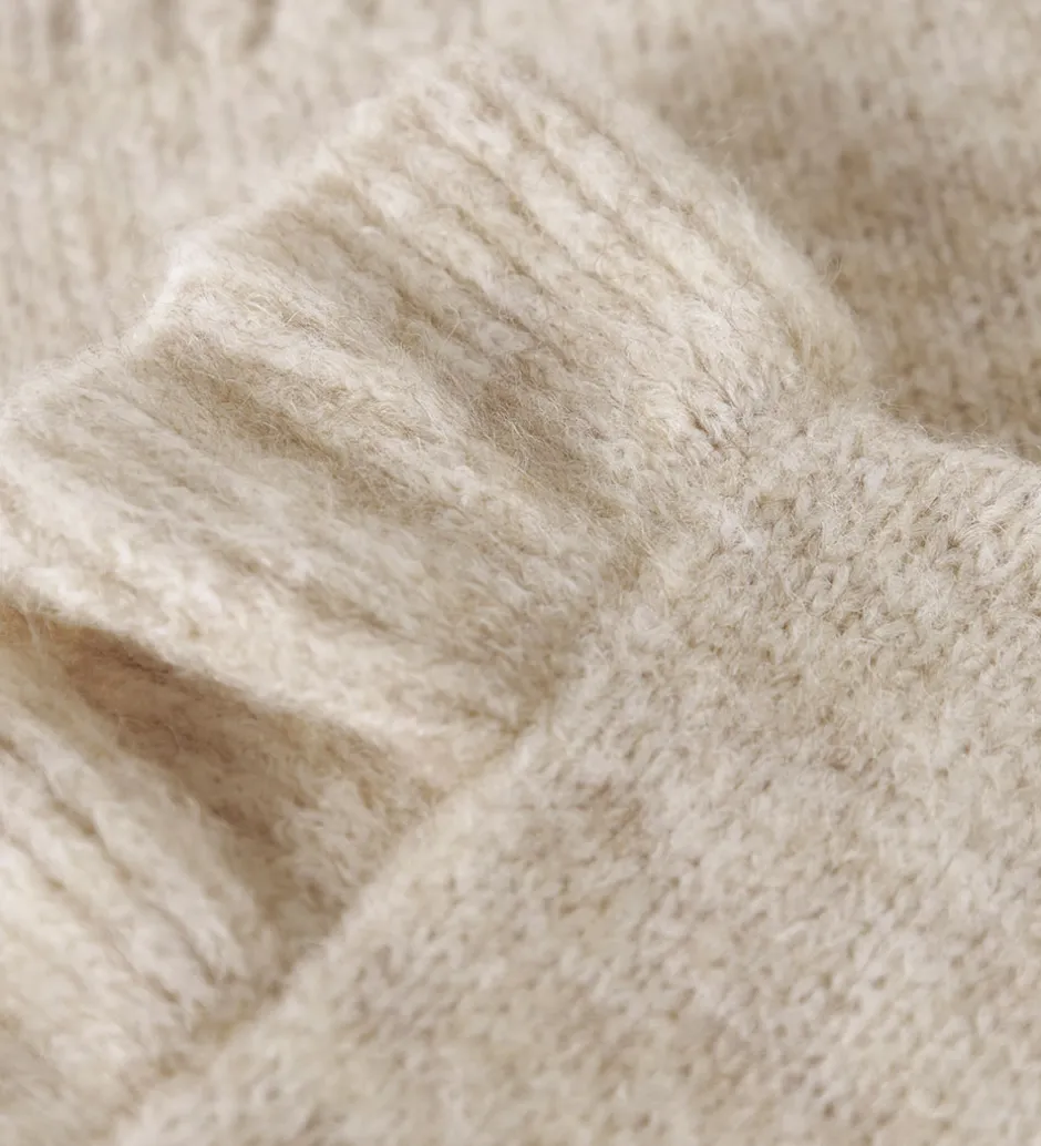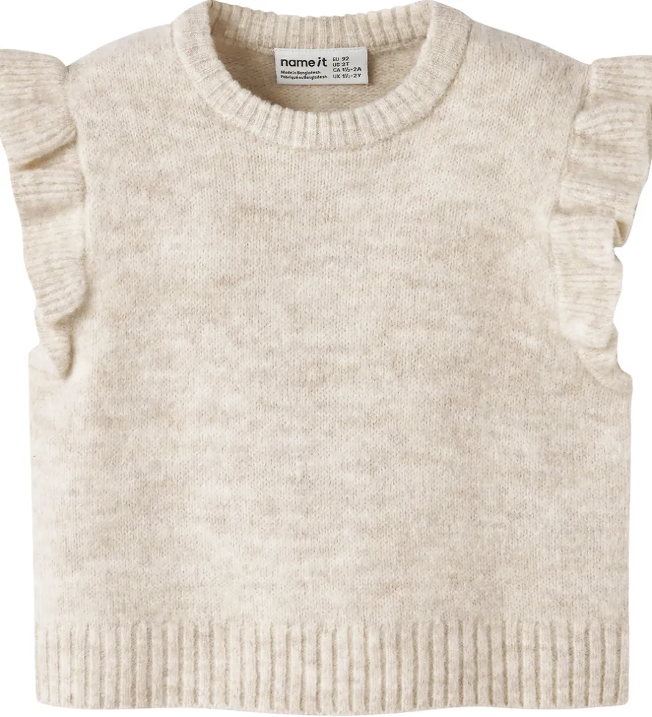 Fin Name It vest i beige strik. Name It vesten har fine flæsedetaljer ved skuldrene og ribkanter, som giver et stilfuldt udtryk.