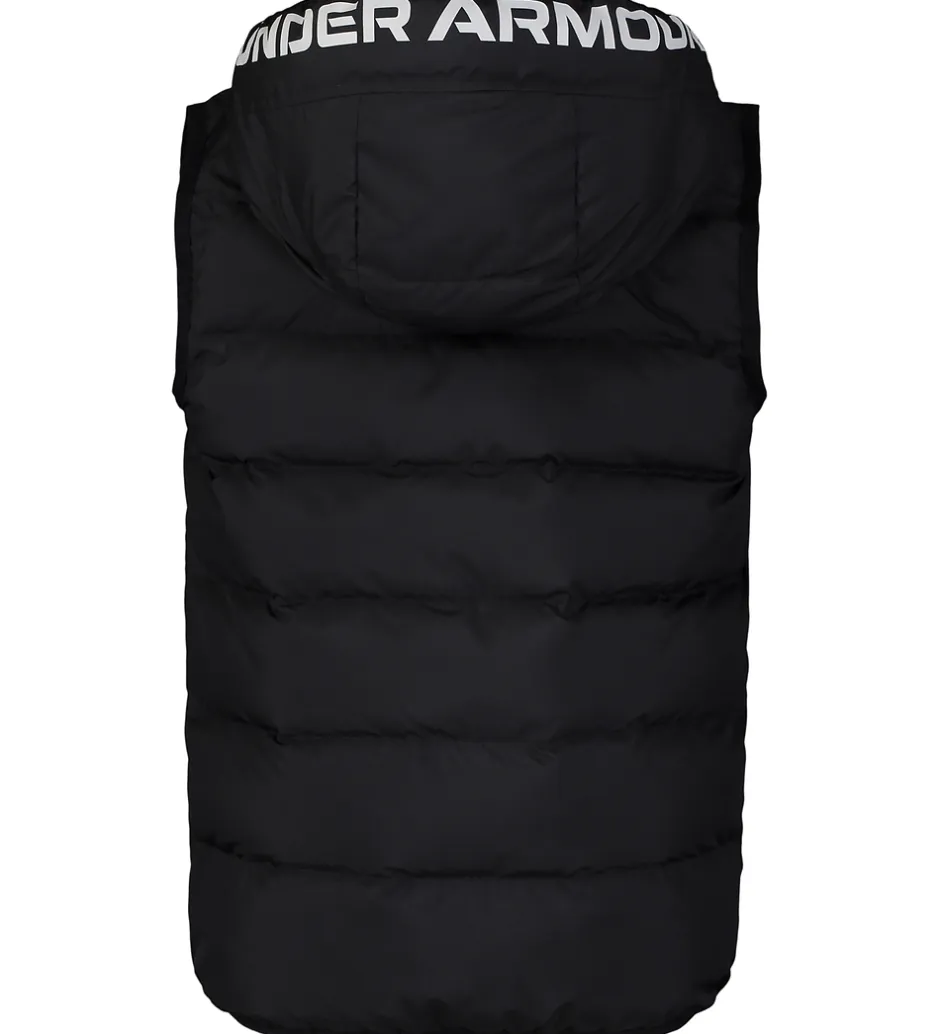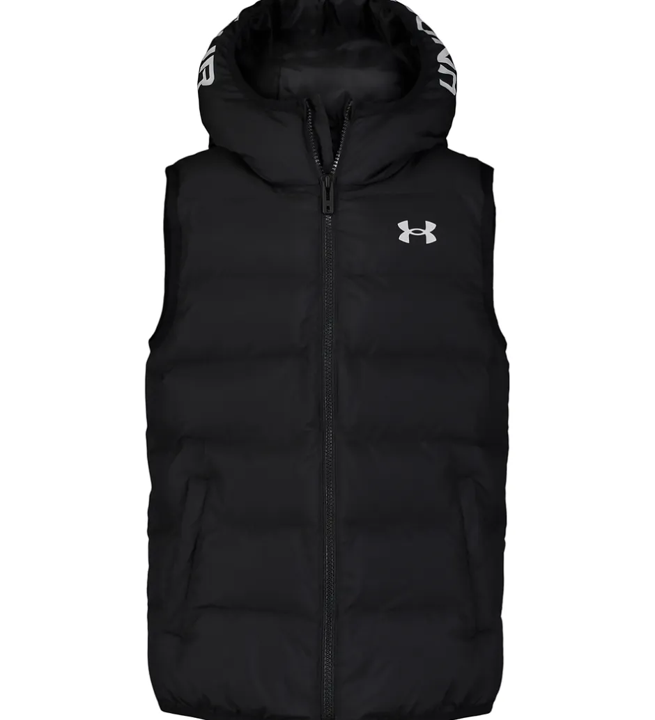 Flot Under Armour dynevest i sort med vandrette syninger med gråt logoprint på venstre bryst samt på hætten. Under Armour dynevesten har en praktisk hætte og gennemgående lynlås med hagebeskytter og indvendig vindstolpe. Fortil er der en lomme i hver side, som lukkes med en trykknap. Indvendigt er der glatvævet for.