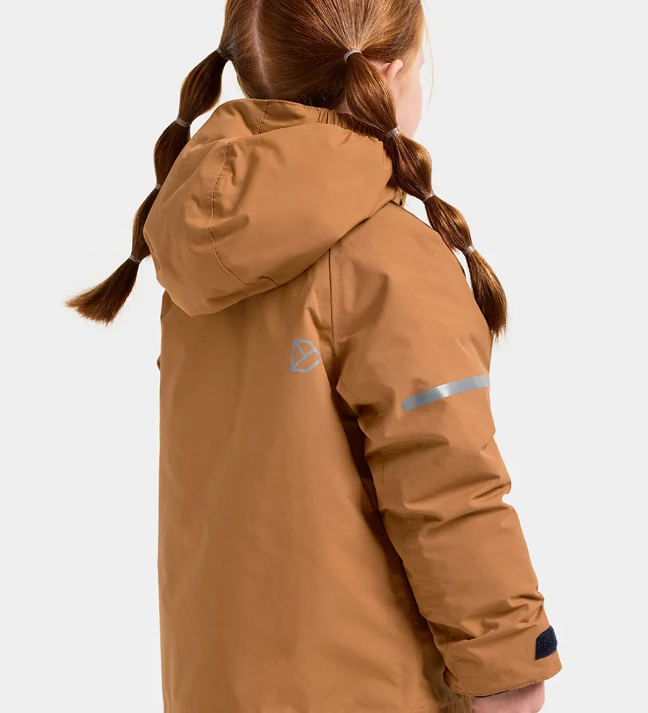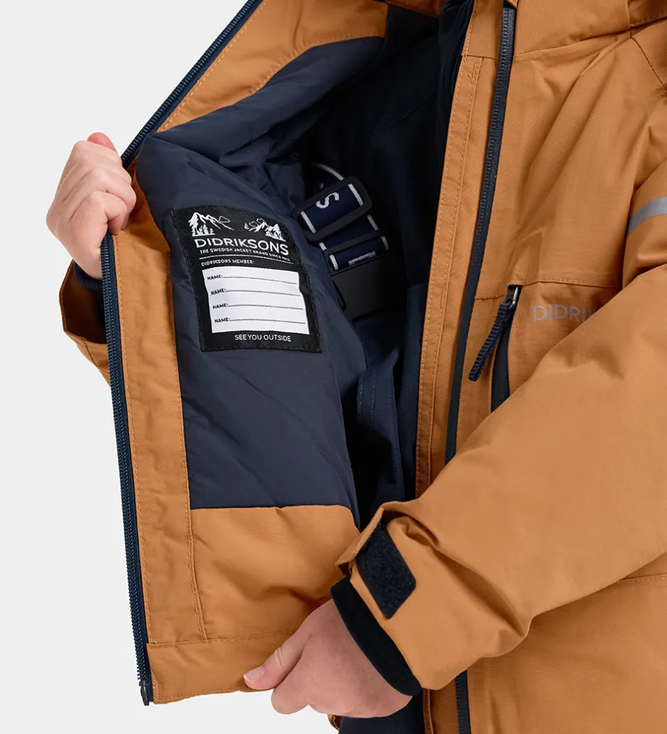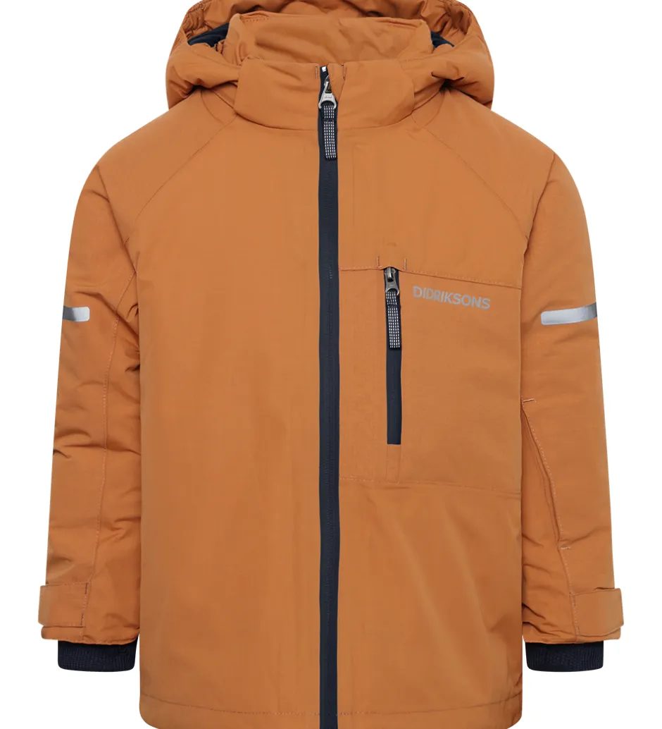 Smart Didriksons vinterjakke i mandelbrun. Vinterjakken er med logoer og refleksprint.
