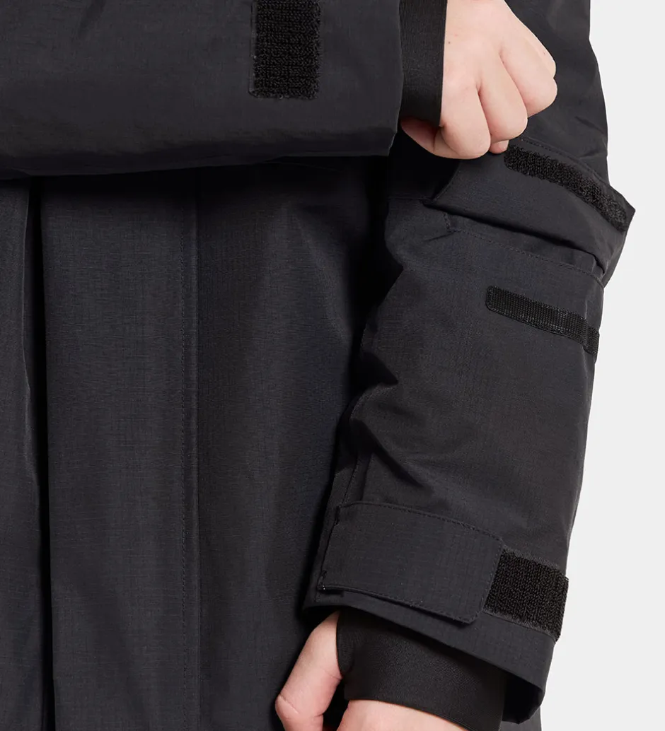 Ved ærmerne er der praktiske snefang med brede, strækbare kanter og et lille hul til tommelfingeren, og ærmekanten kan strammes ind med en velcrorem. På indersiden ved ærmekanten er der en praktisk plastring, som Didriksons handsker og luffer kan hægtes på.