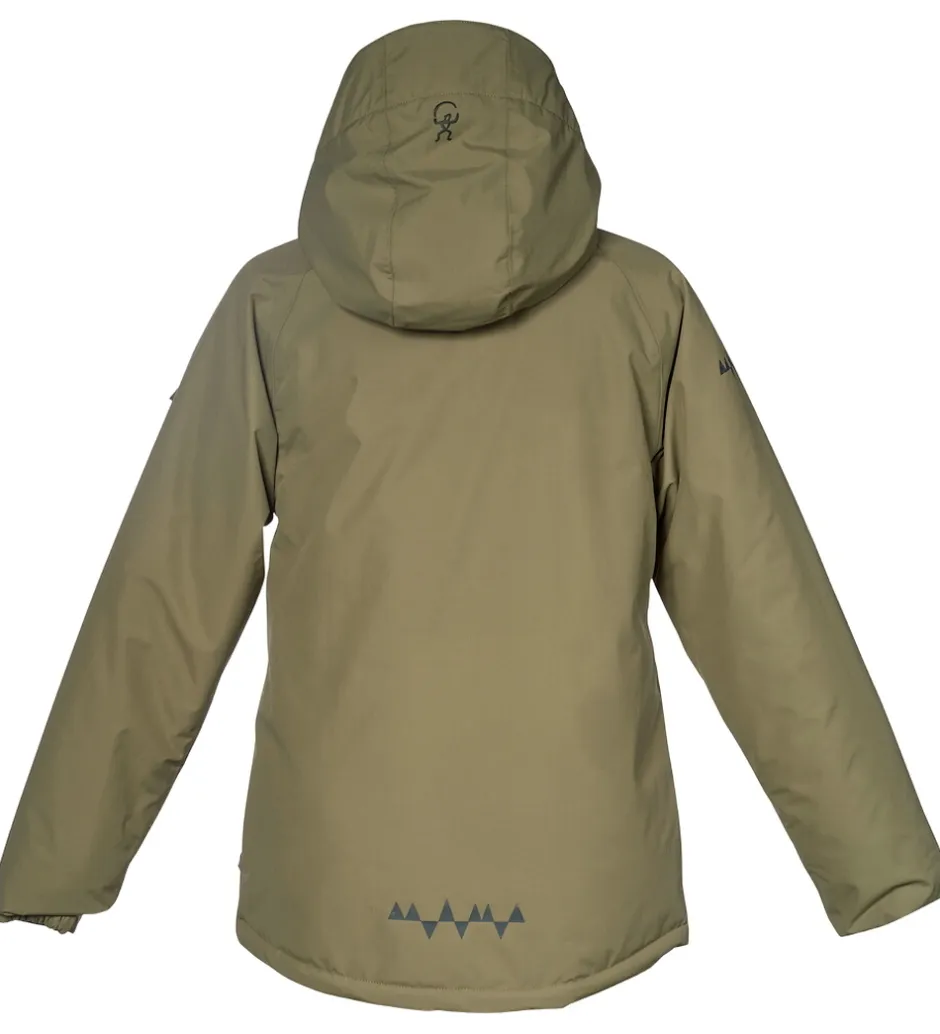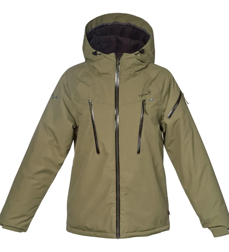 Flot Isbjörn Of Sweden vinterjakke i støvet grøn. Vinterjakken har grå logoprint på venstre bryst og hætten samt smarte refleksprint på lænden og højre skulder.