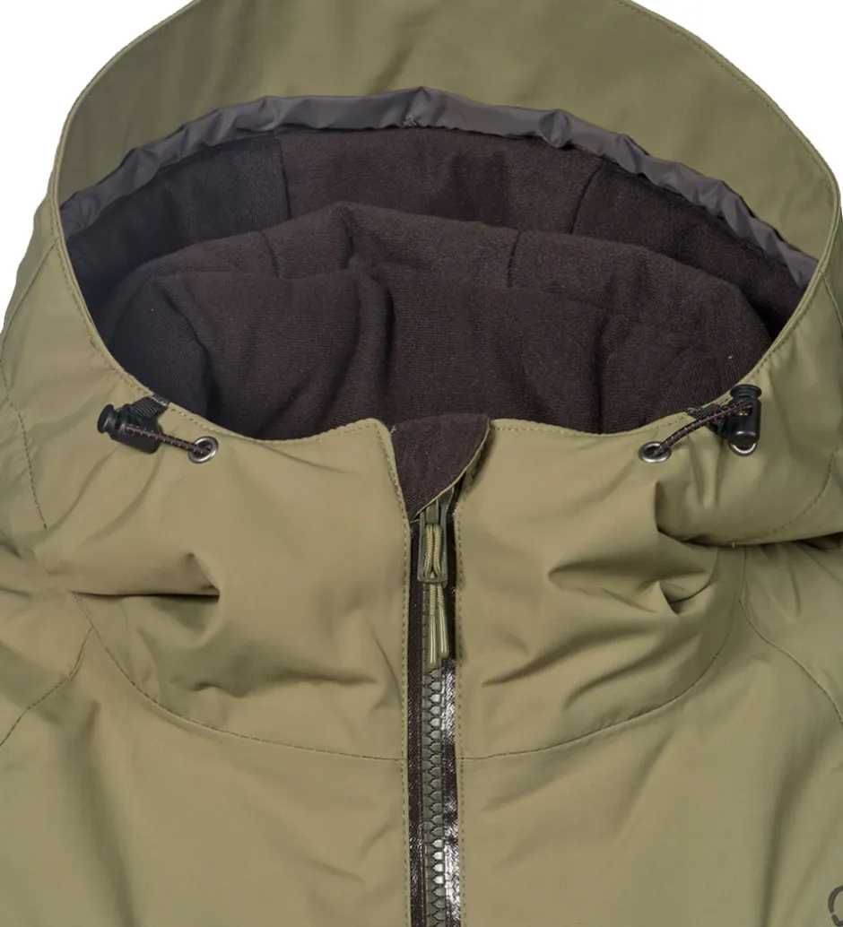 Ærmernes åbninger har praktiske elastikkanter, der kan strammes ind med velcroremme, og snefang med brede, elastiske kanter. På venstre overarm er der en lynlåslomme.