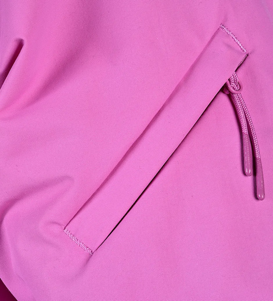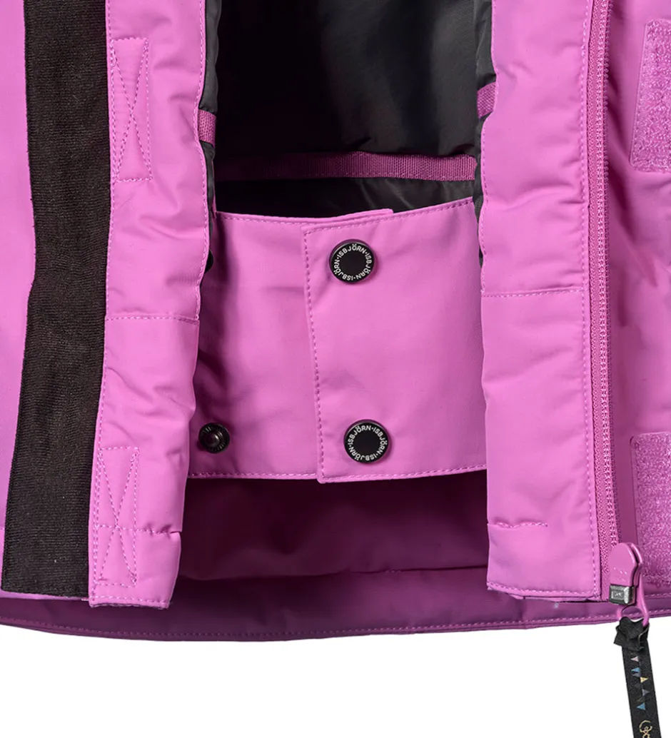 Ærmernes åbninger har praktiske elastikkanter, der kan strammes ind med velcroremme, og snefang med brede, elastiske kanter. På venstre overarm er der en lynlåslomme.