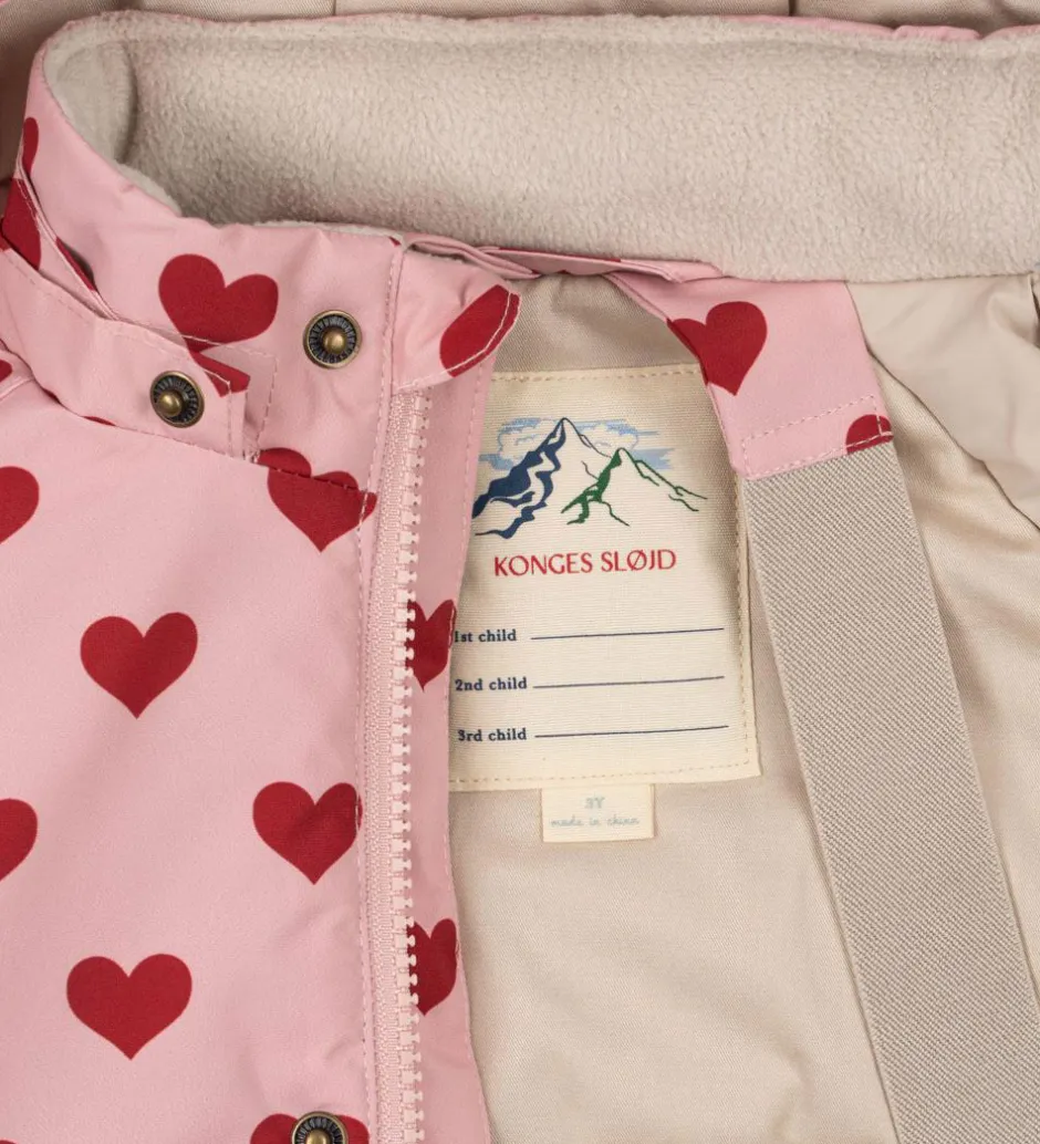 Sød Konges Sløjd vinterjakke i rosa med et alloverprint af røde hjerter.