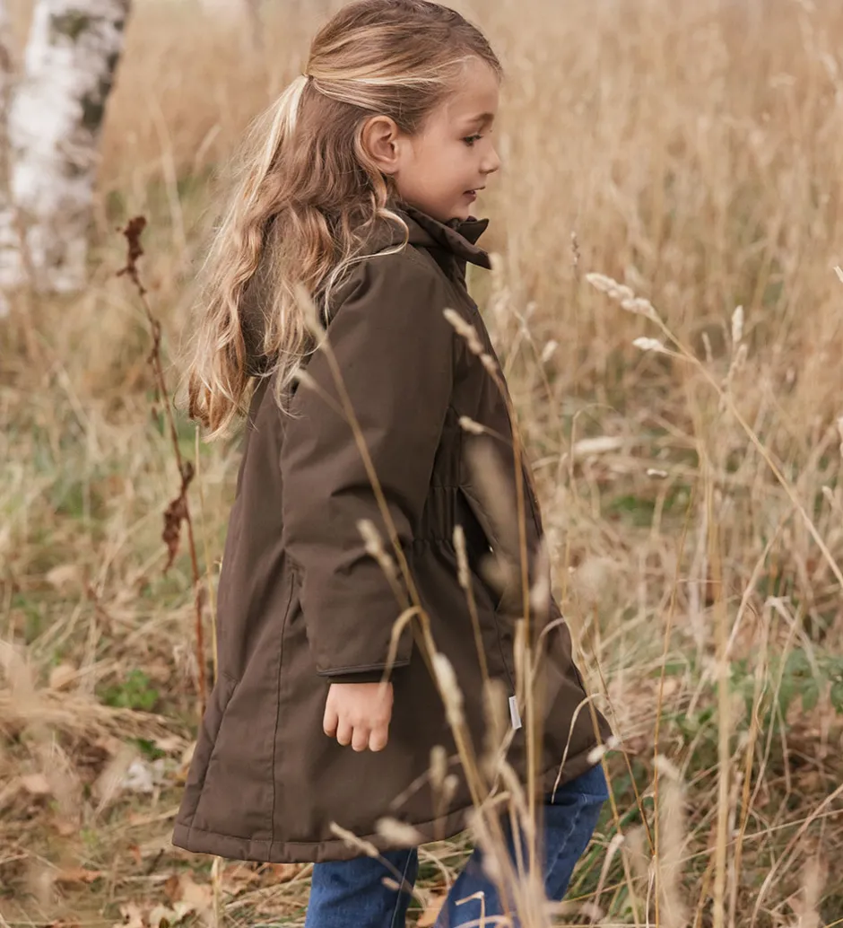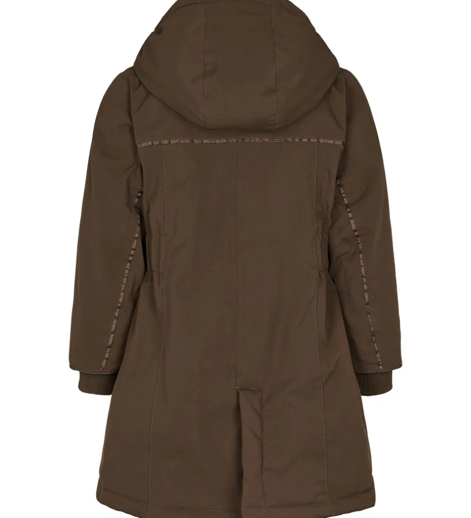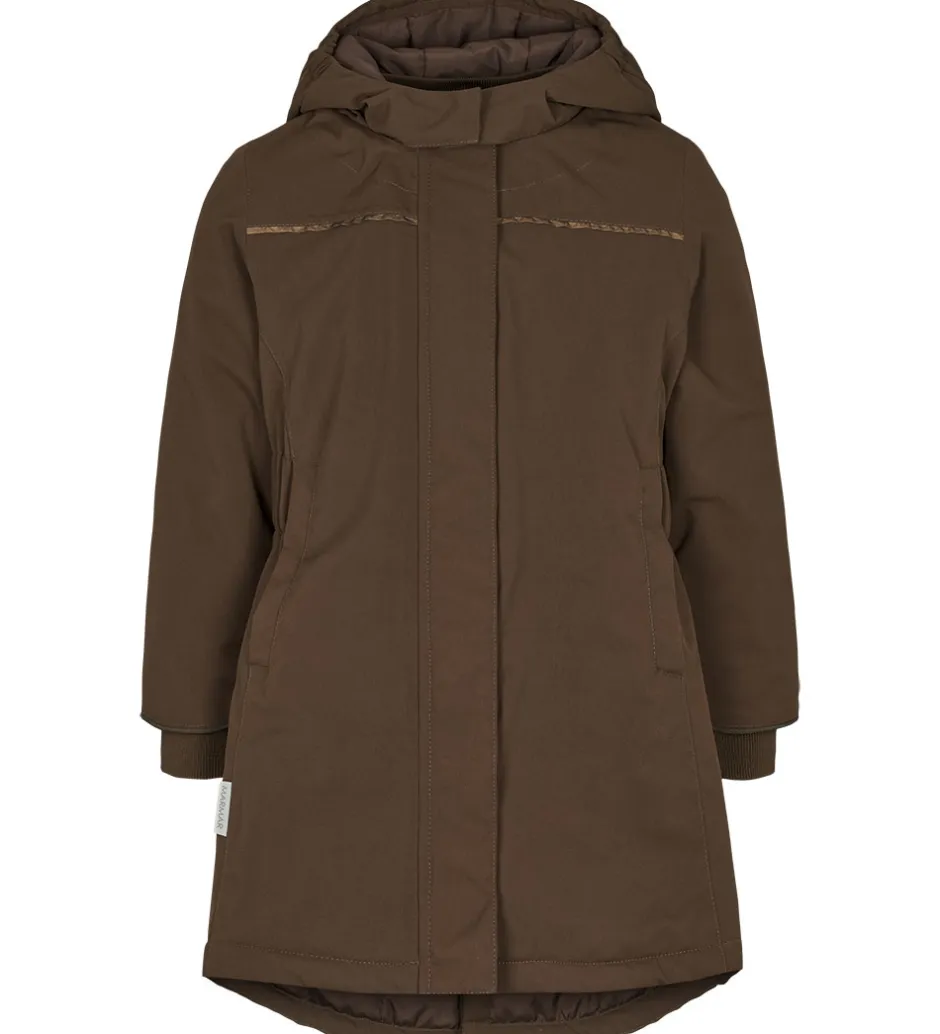 Stilfuld MarMar vinterjakke i mørkebrun med praktiske refleksdetaljer.