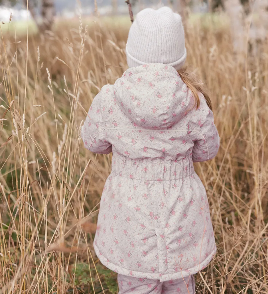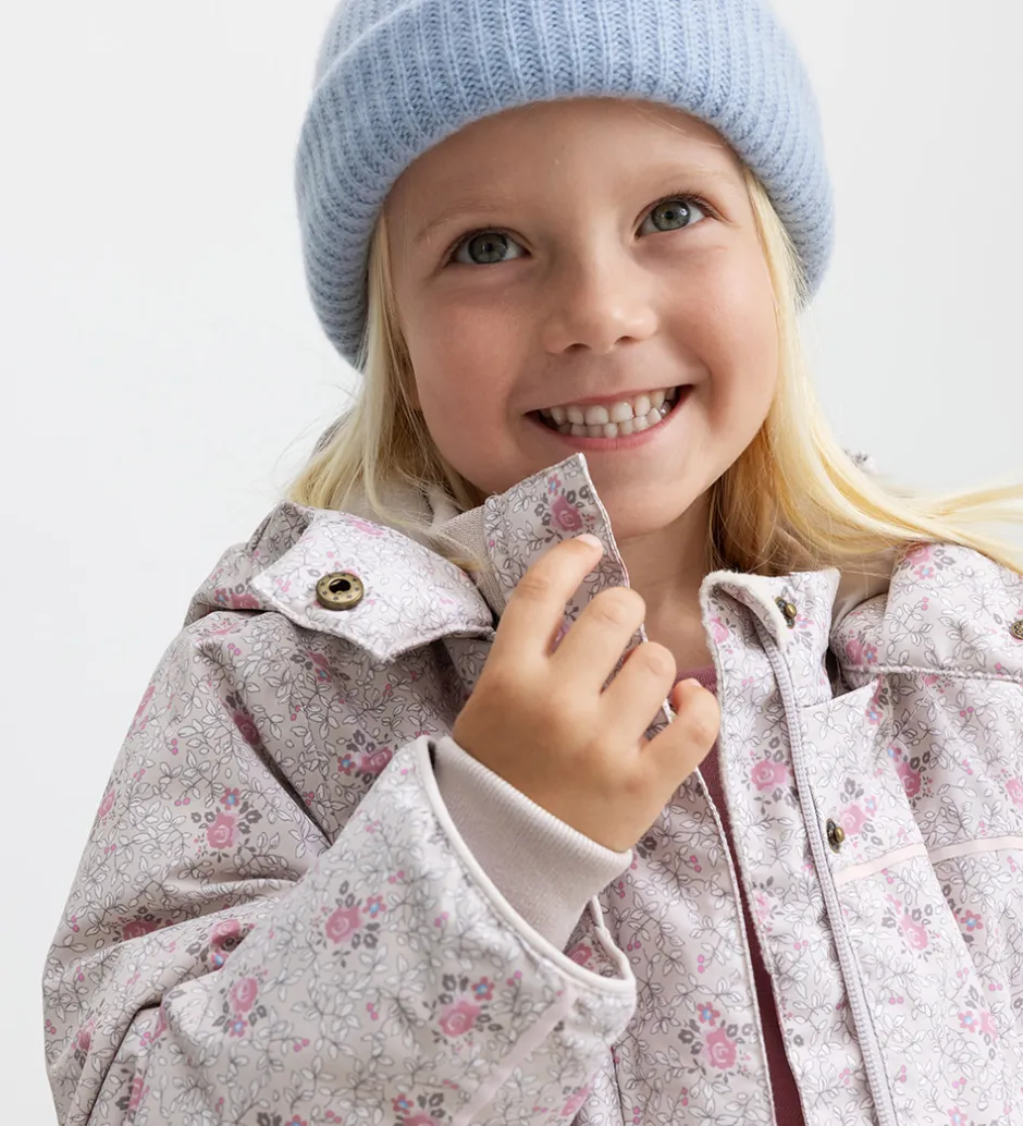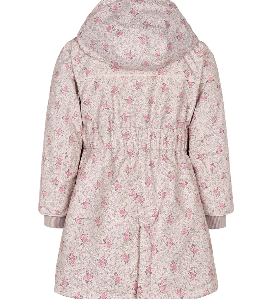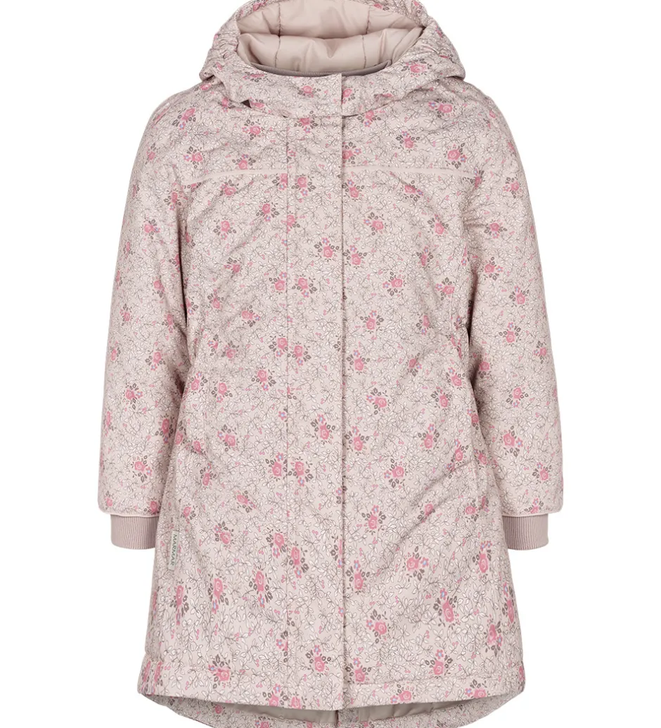 Fin MarMar vinterjakke i lys rosa med blomsterprint i rosa og brun med blå detaljer. Vinterjakken har praktiske refleksdetaljer.