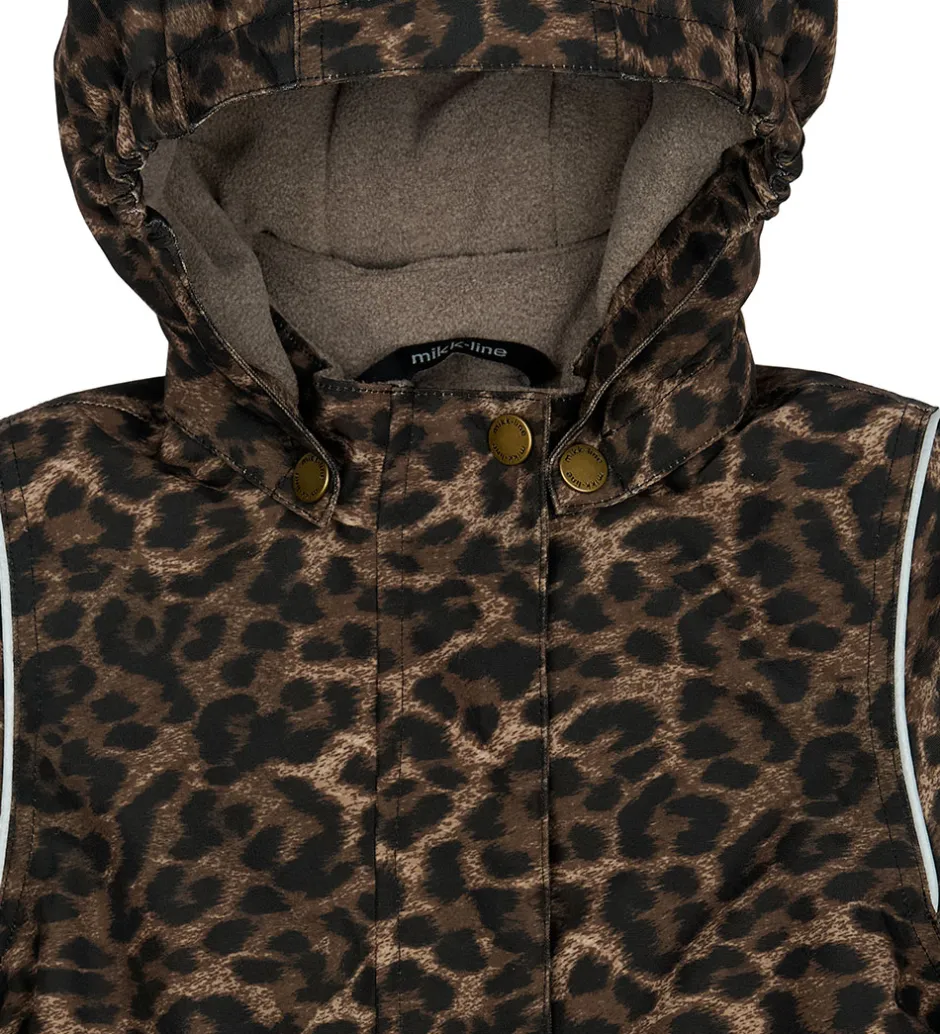 Pæn Mikk-Line vinterjakke med et leopardprint i brune og sorte nuancer. Vinterjakken har refleksdetaljer på hætten, nederst på ryggen og omkring skuldrene.