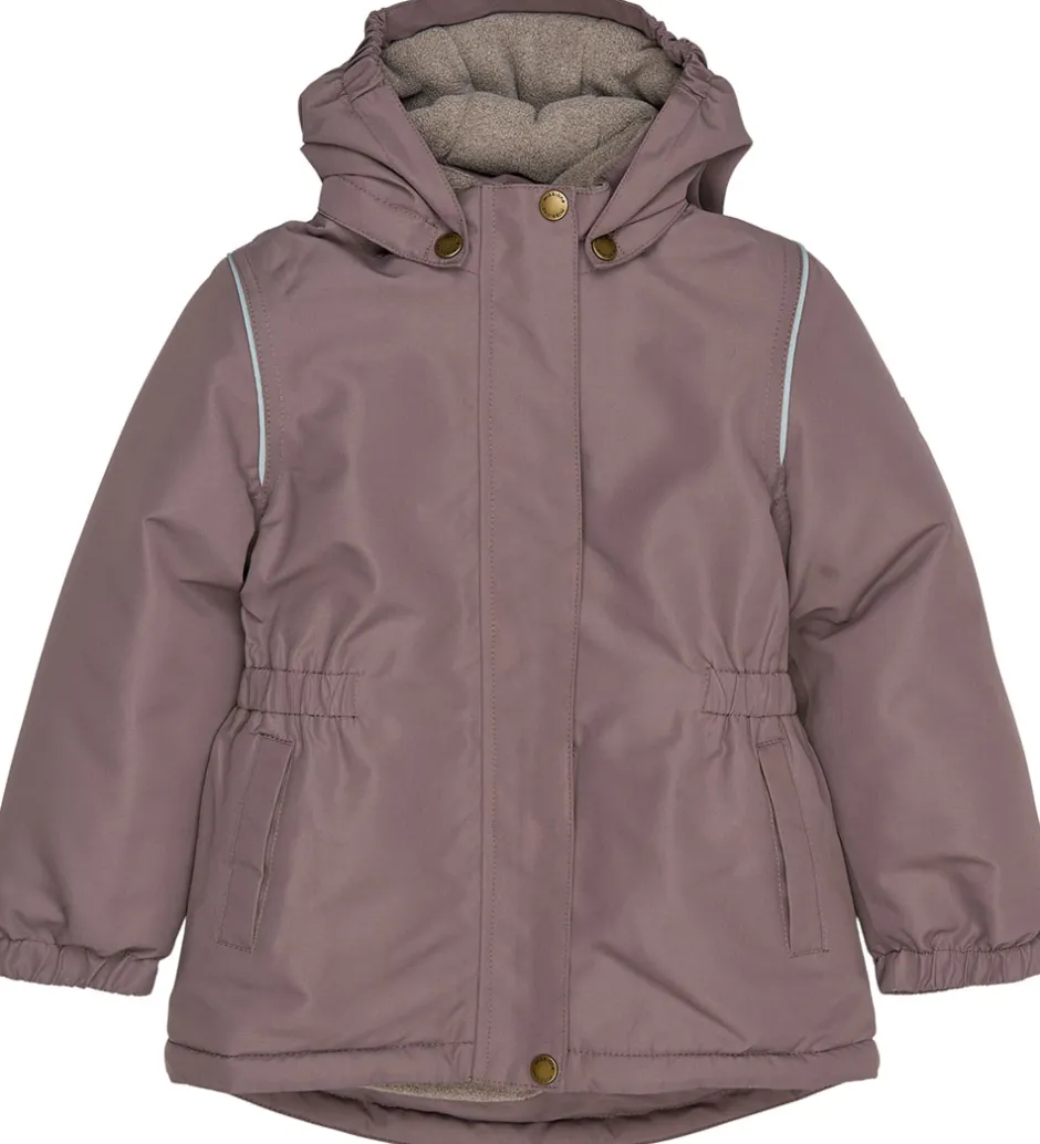 Pæn Mikk-Line vinterjakke i mørk, støvet lilla. Vinterjakken har refleksdetaljer på hætten, nederst på ryggen og omkring skuldrene.