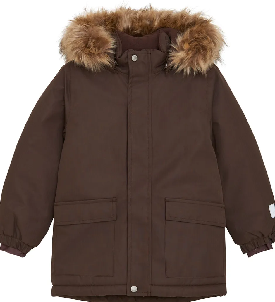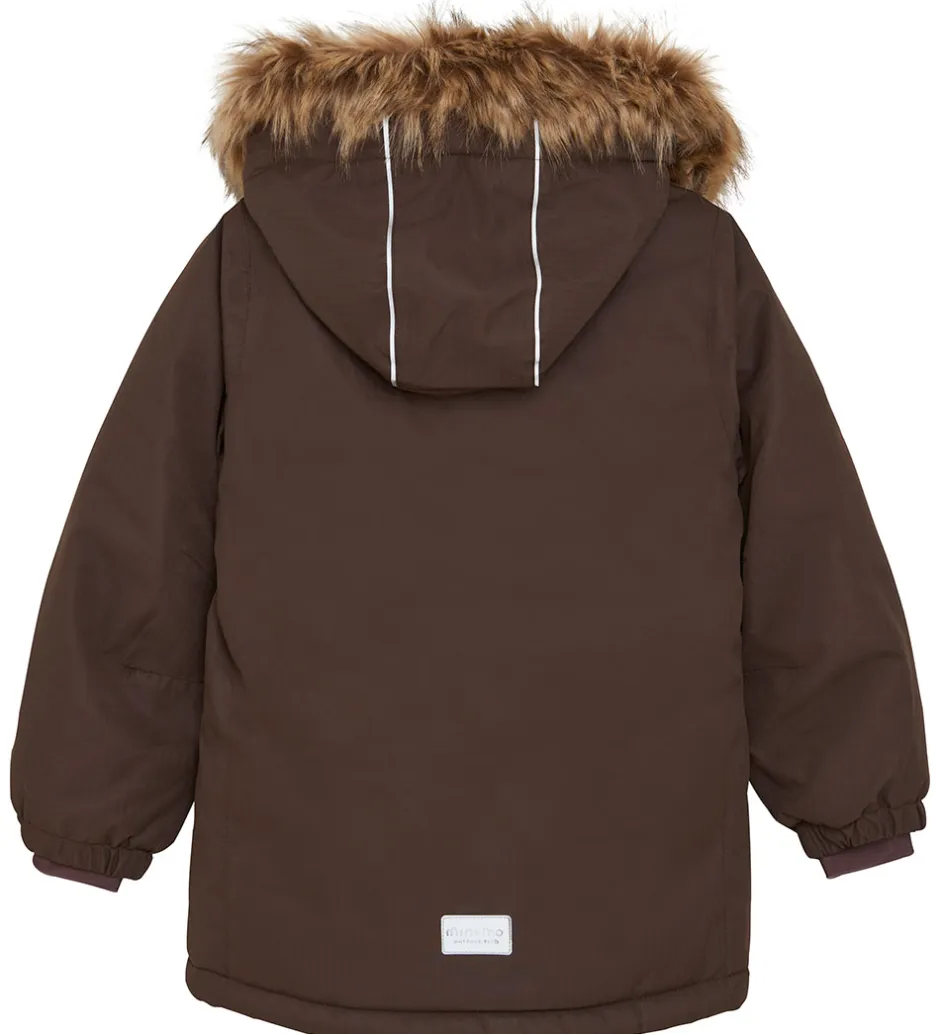Skøn Minymo vinterjakke i brun med refleksdetaljer på hætten og på ryggen.