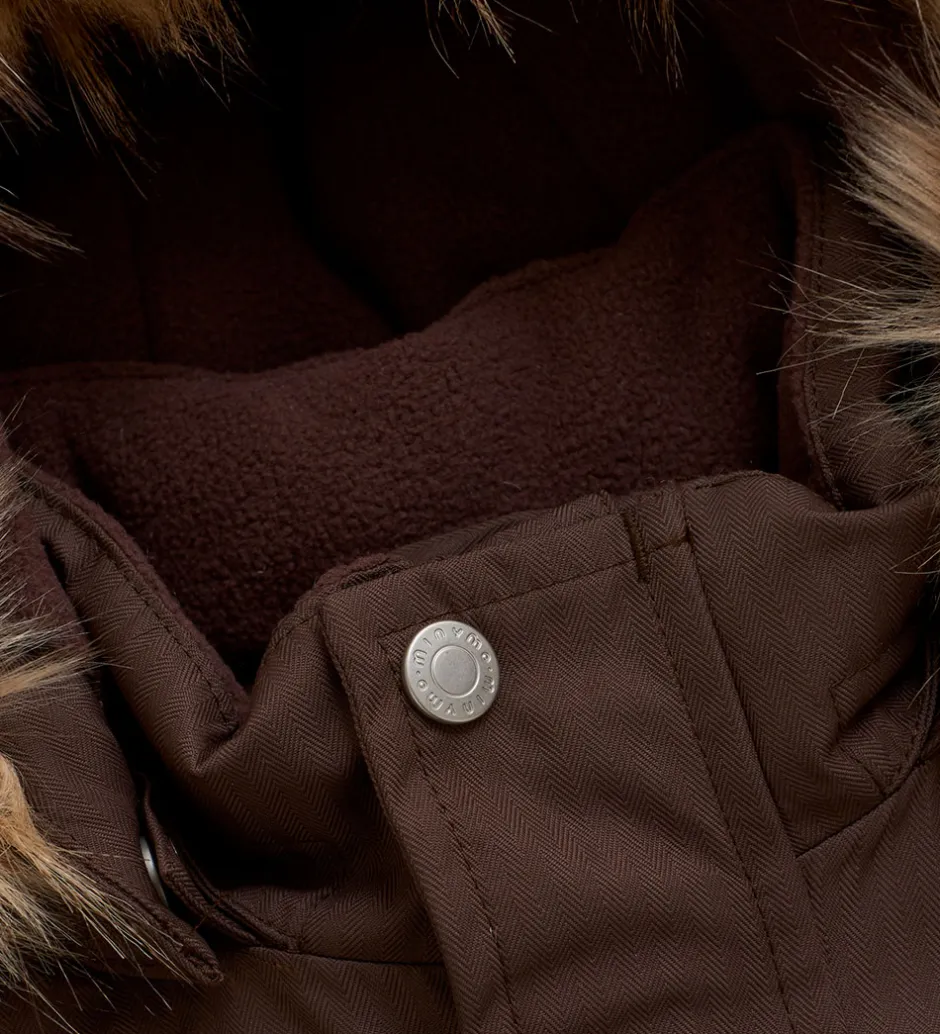 Minymo vinterjakken har en aftagelig hætte, som sidder fast på kraven med trykknapper. Langs hætten er der en fin, aftagelig kant i imiteret pels. Vinterjakken lukkes fortil med en gennemgående lynlås med hagebeskytter og dobbelt vindstolpe, hvoraf den yderste kan lukkes med velcro og trykknapper. I ærmerne er der elastikkanter og snefang. Fortil er der en klaplomme i hver side, som lukkes med velcro.