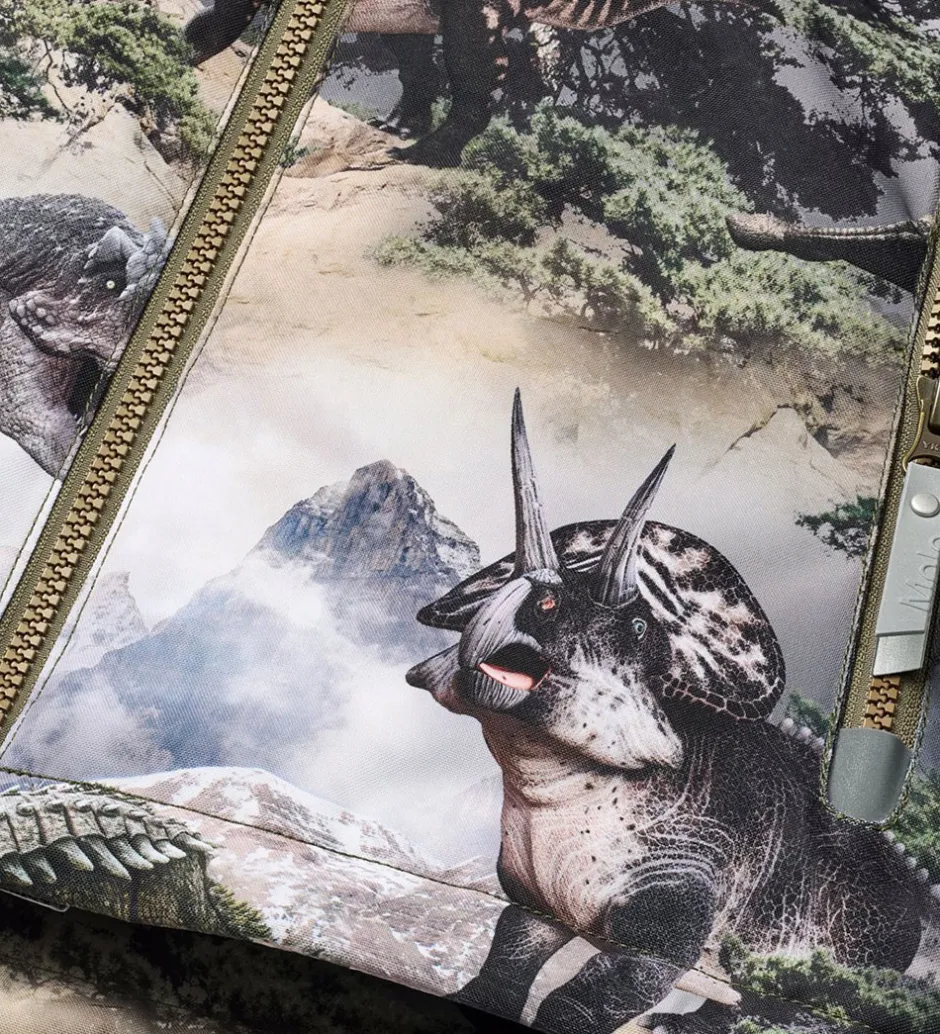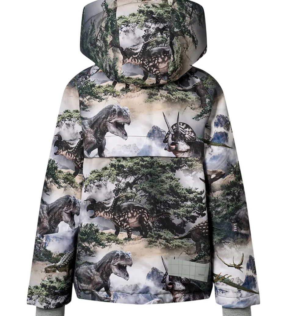 Flot Molo vinterjakke med et alloverprint med et bjerglandskab med dinoer i nuancer af grøn, grå og brun. Vinterjakken har en gummi-logoapplikation på venstre bryst samt logoreflekser og reflekspipings.