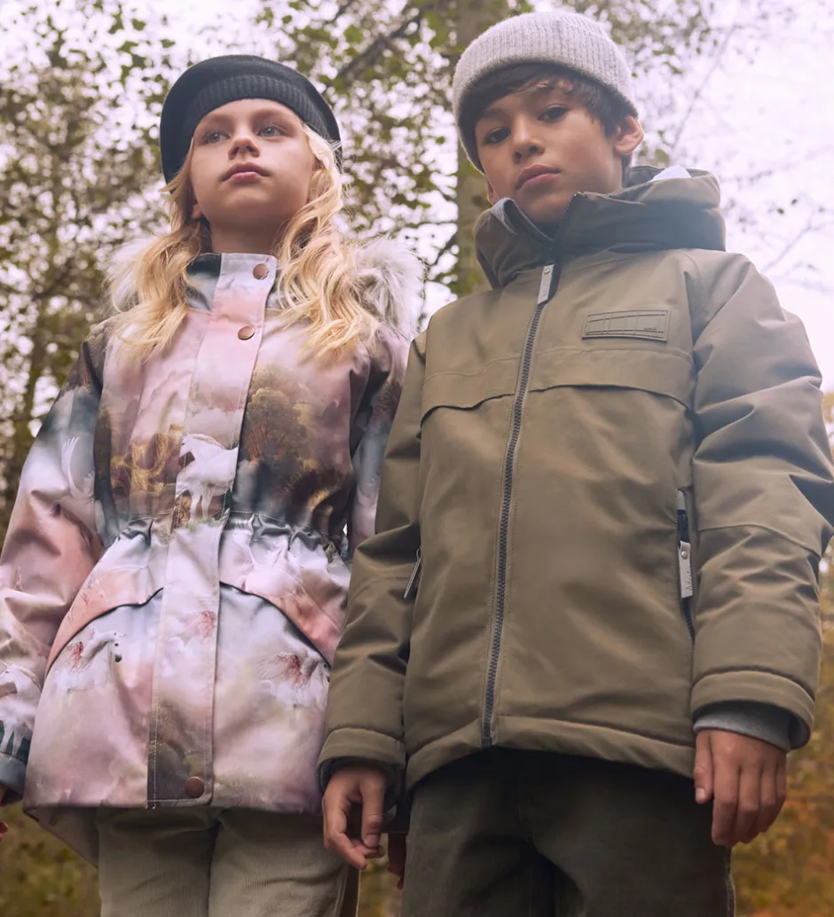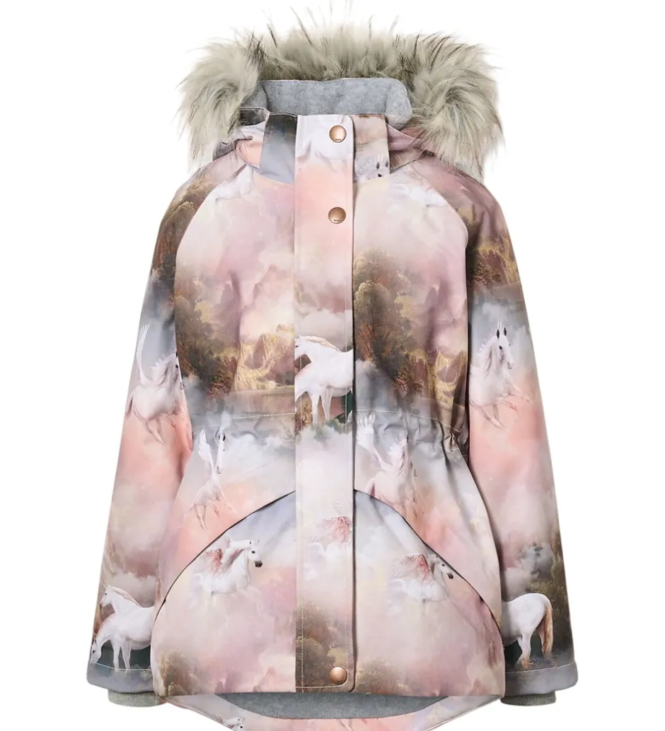 Flot Molo vinterjakke med et udtryk af rosa og grå nuancer med et smukt landskabsprint med enhjørninger. Bagtil er der et logo-refleksprint.