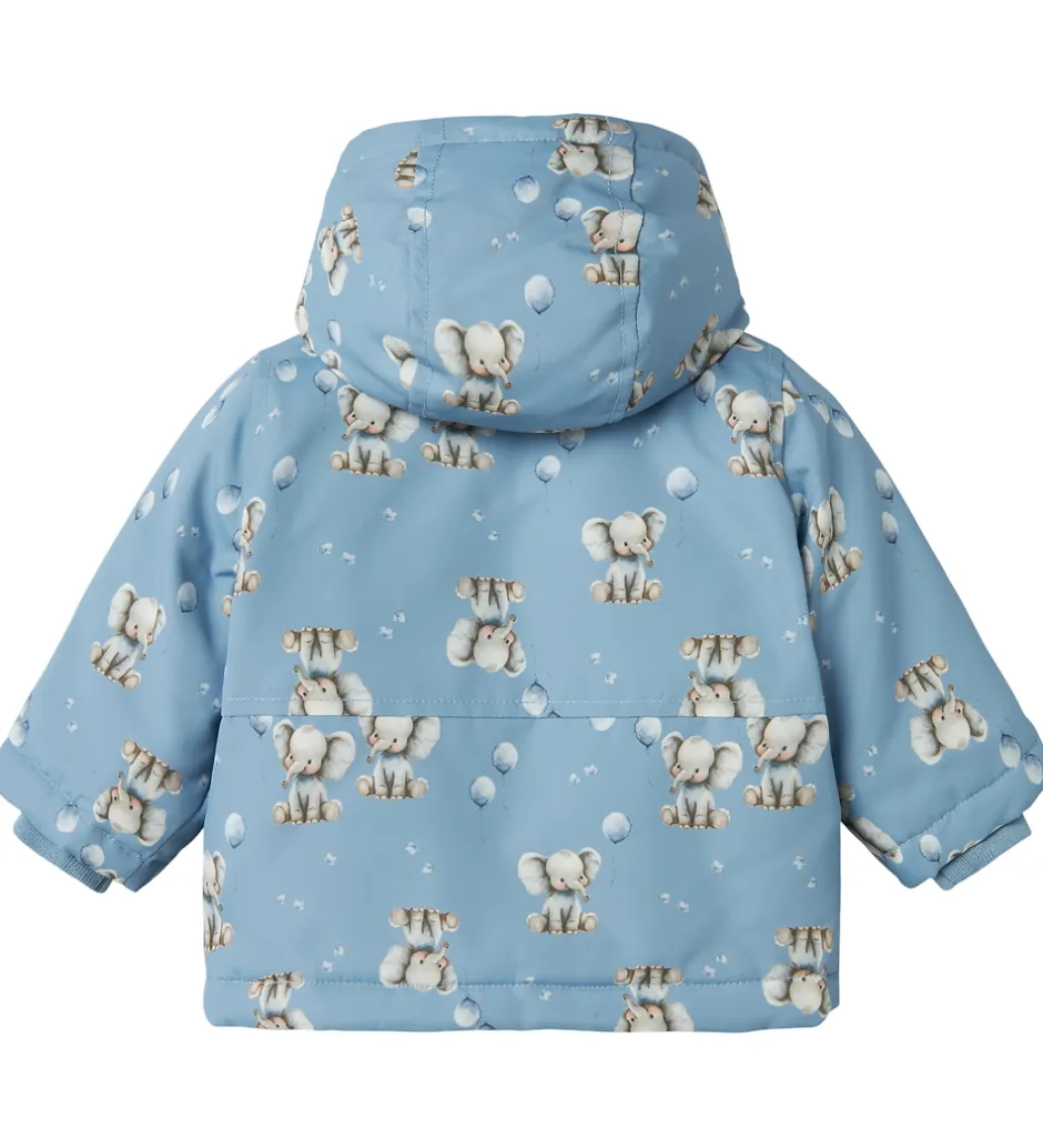 Smuk Name It vinterjakke i en lys, blå farve med et bedårende print af elefanter og små ballonmotiver.