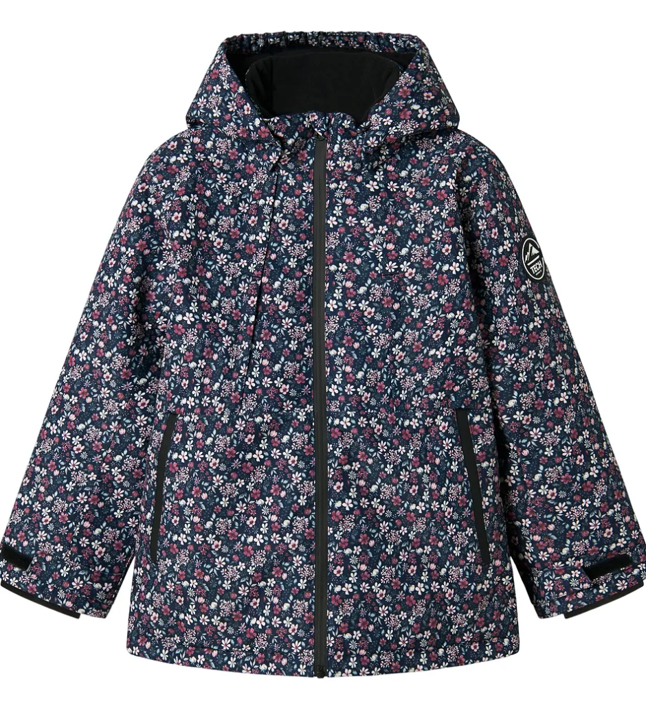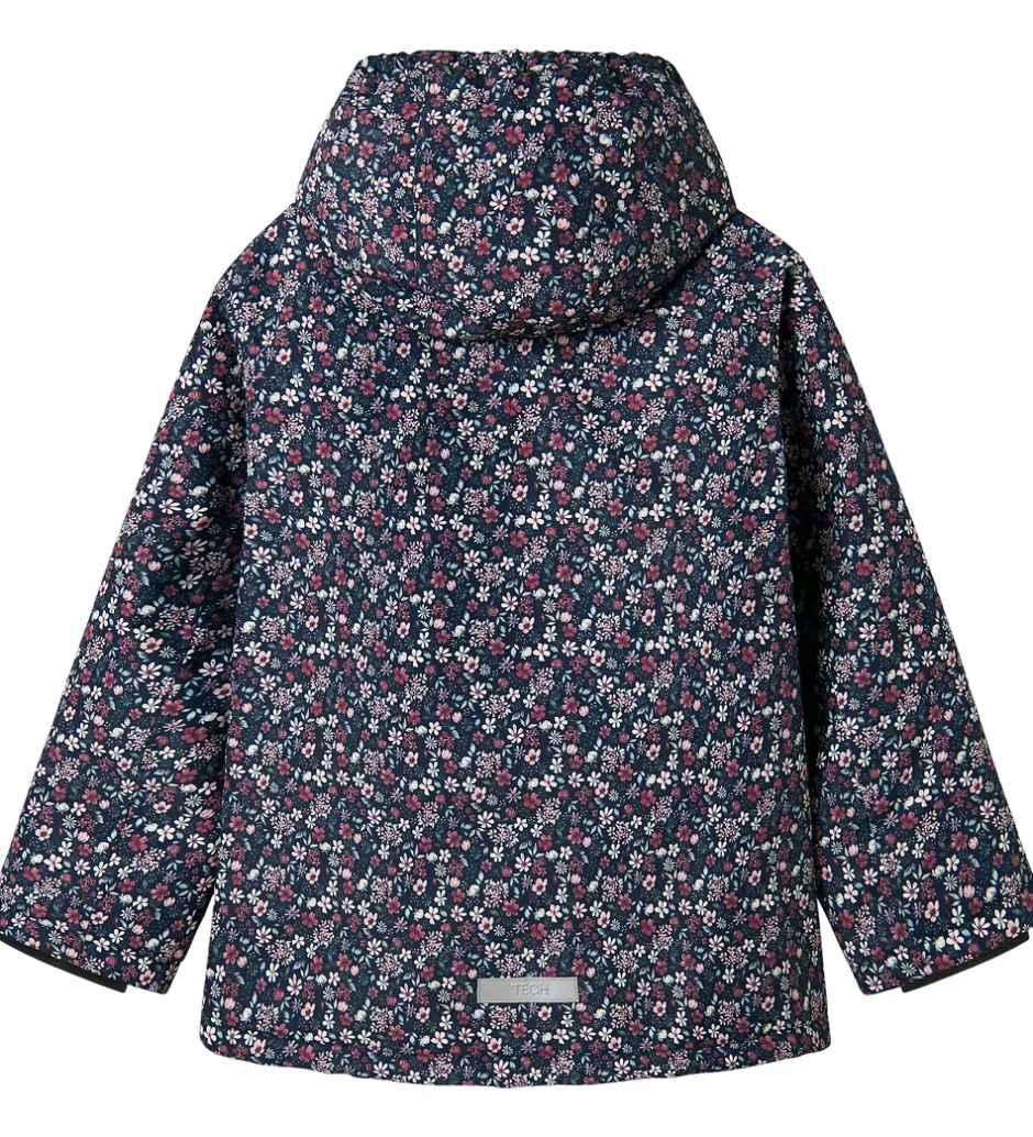 Fin Name It vinterjakke i navyblå med blomstret print i lilla, hvide og grønne nuancer.