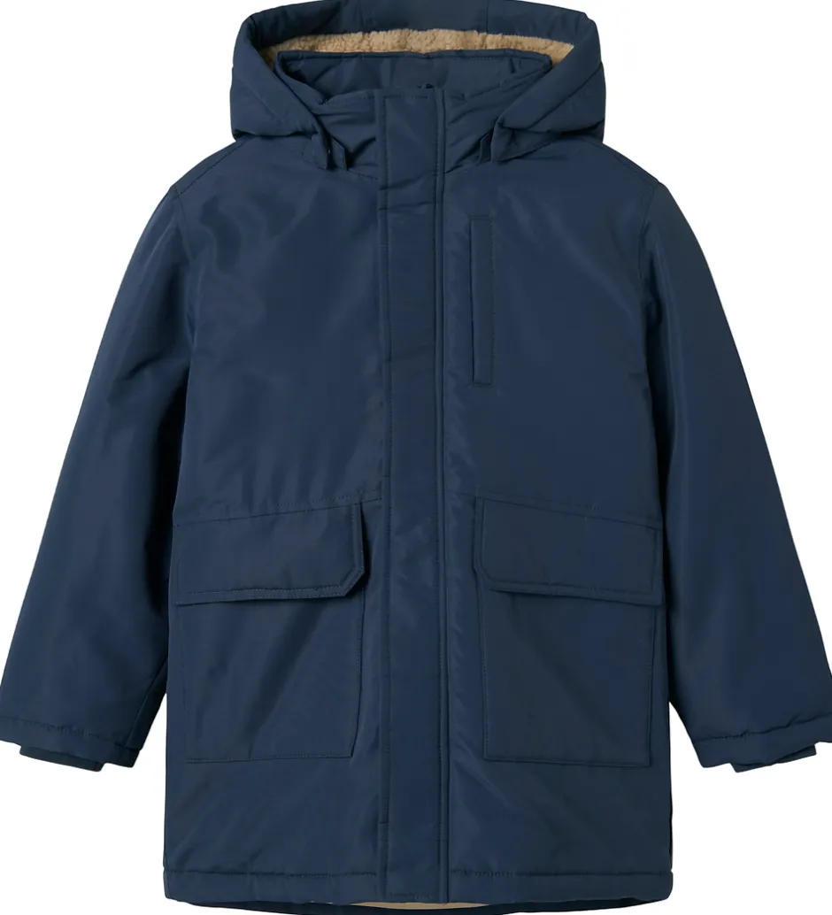 Stilfuld Name It vinterjakke i en flot mørkeblå nuance og med for af beige teddyfleece. Vinterjakken har en praktisk hætte og rummelige lommer, der gør den både funktionel og moderne. Ærmerne har snefang og ribkanter. Name It vinterjakkenjakken er ideel til de kølige årstider.
