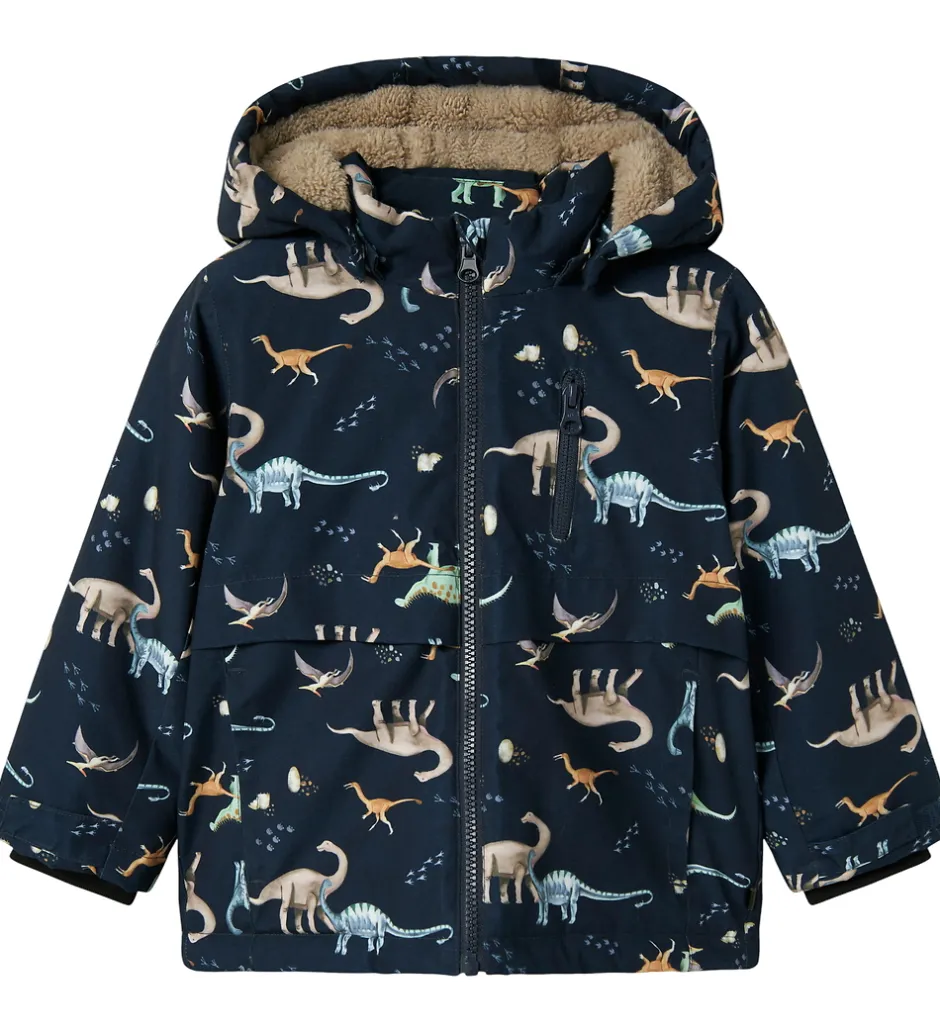 Flot Name It vinterjakke i navyblå med et farverigt alloverprint af dinoer. Vinterjakken har velplacerede reflekspipings og reflekser.