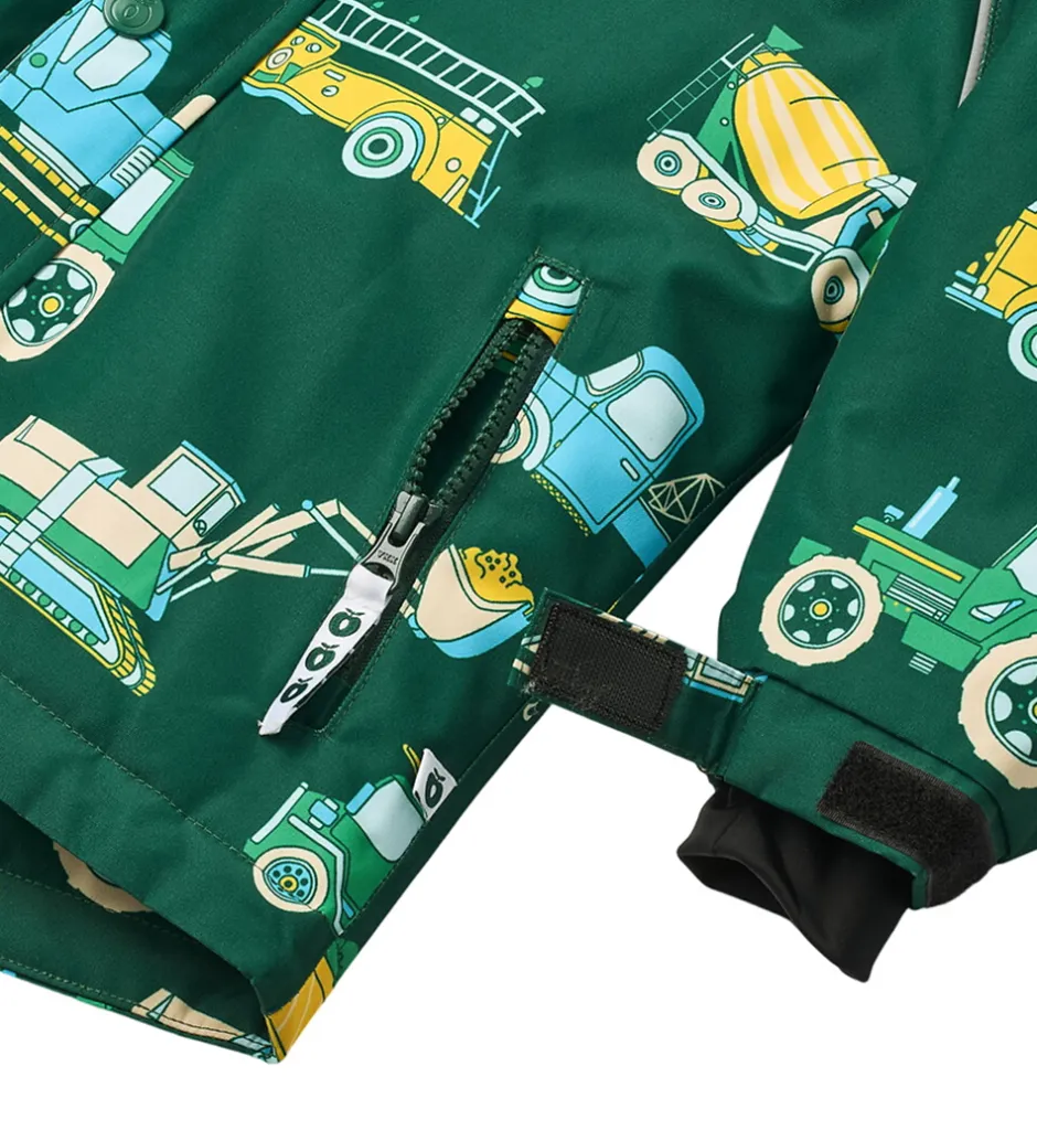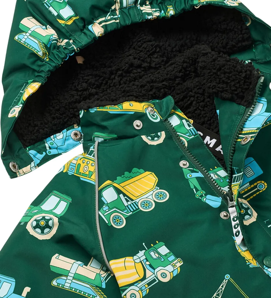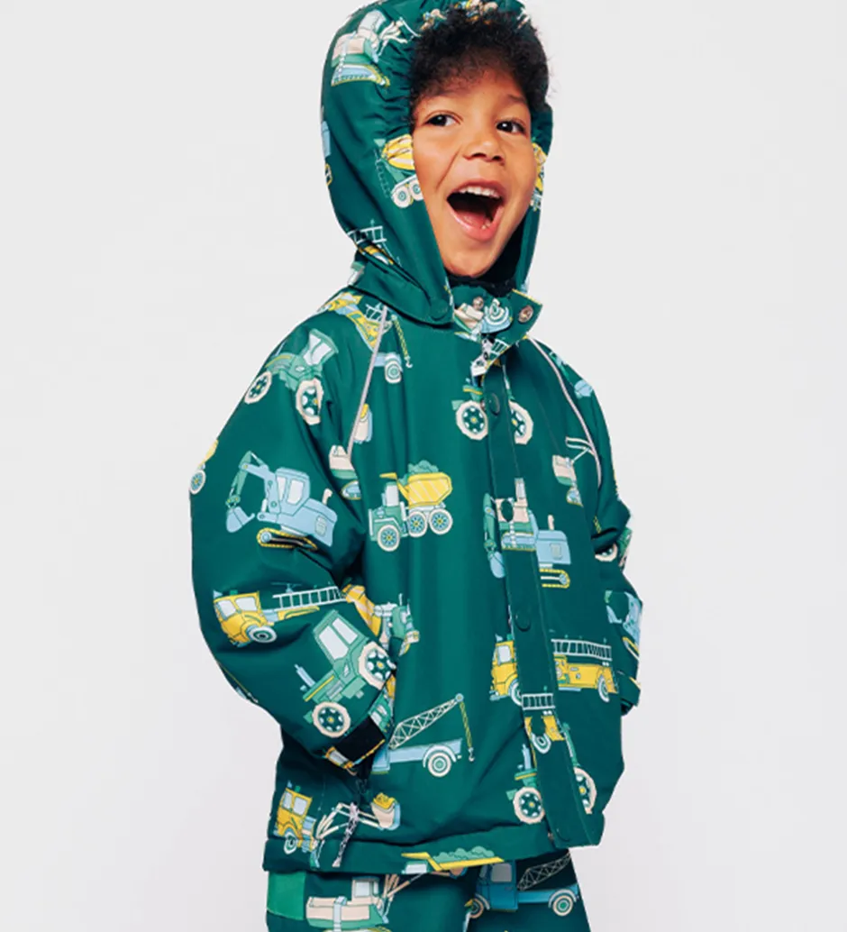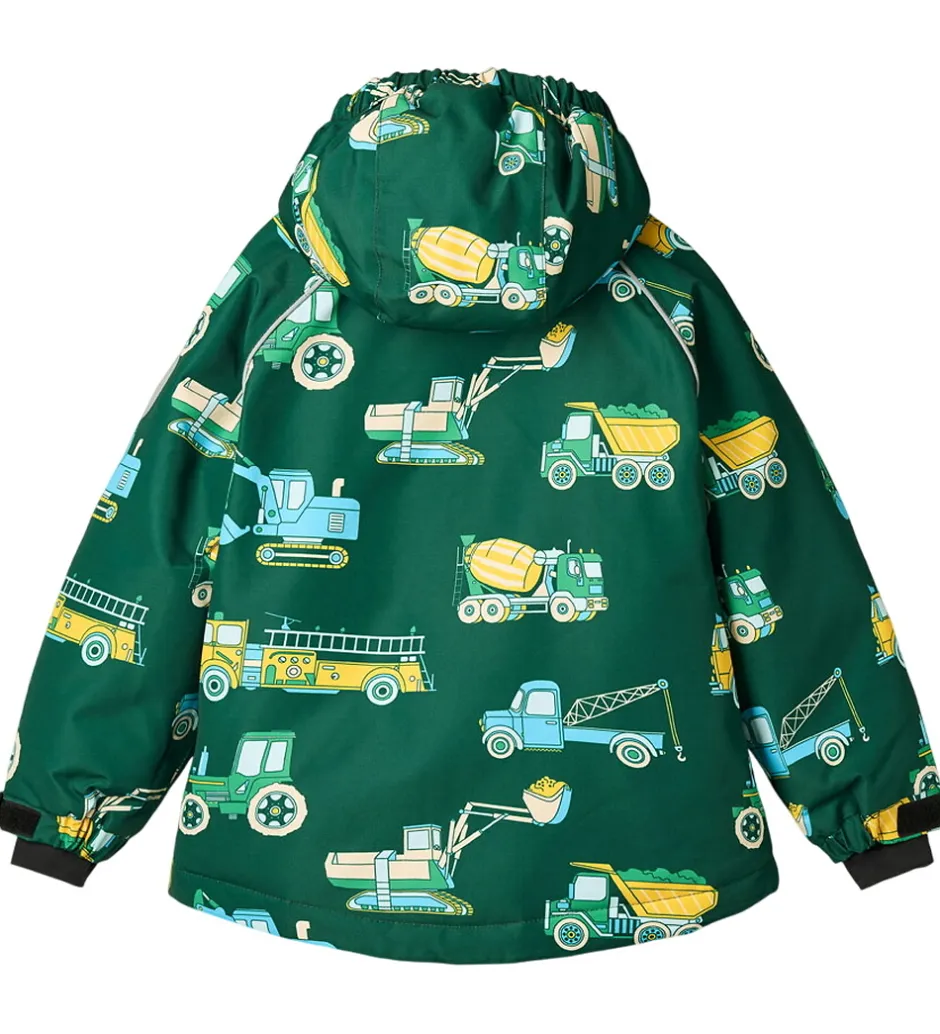 Skøn Småfolk vinterjakke i mørkegrøn med et alloverprint af farverige arbejdsbiler. Rundt om ærmene er der praktiske reflekspipings.