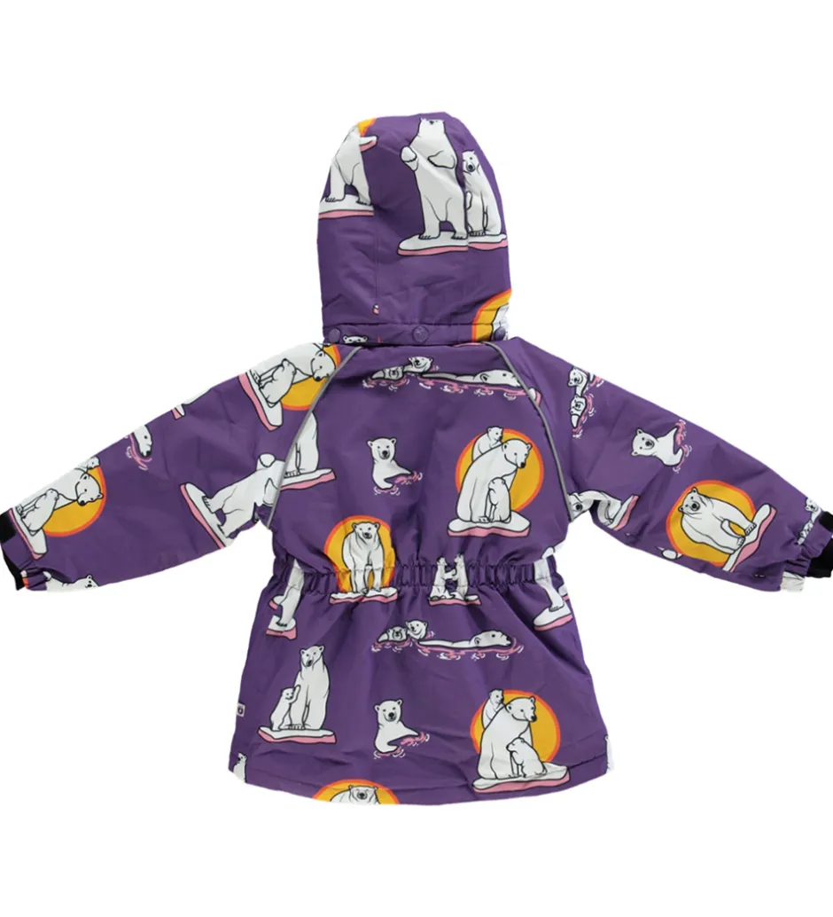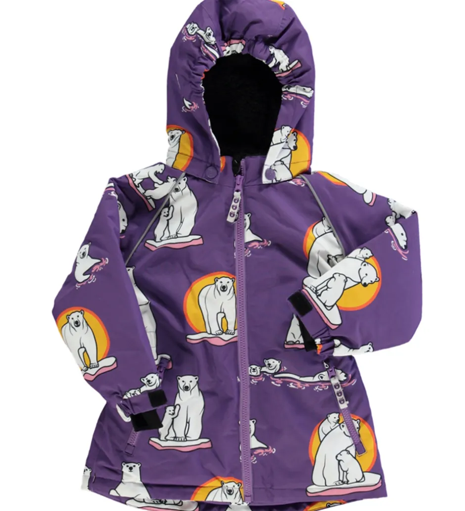 Skøn Småfolk vinterjakke i lilla med et alloverprint af søde isbjørne.