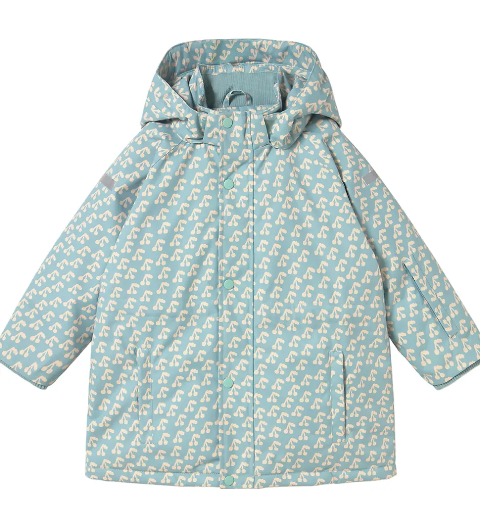 Sød Tiny Cottons vinterjakke i lyseblå med et flot alloverprint af hvide kirsebær.
