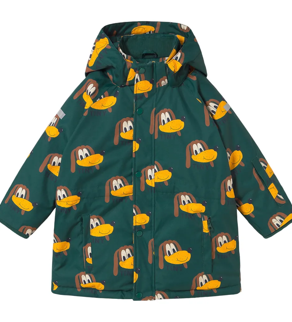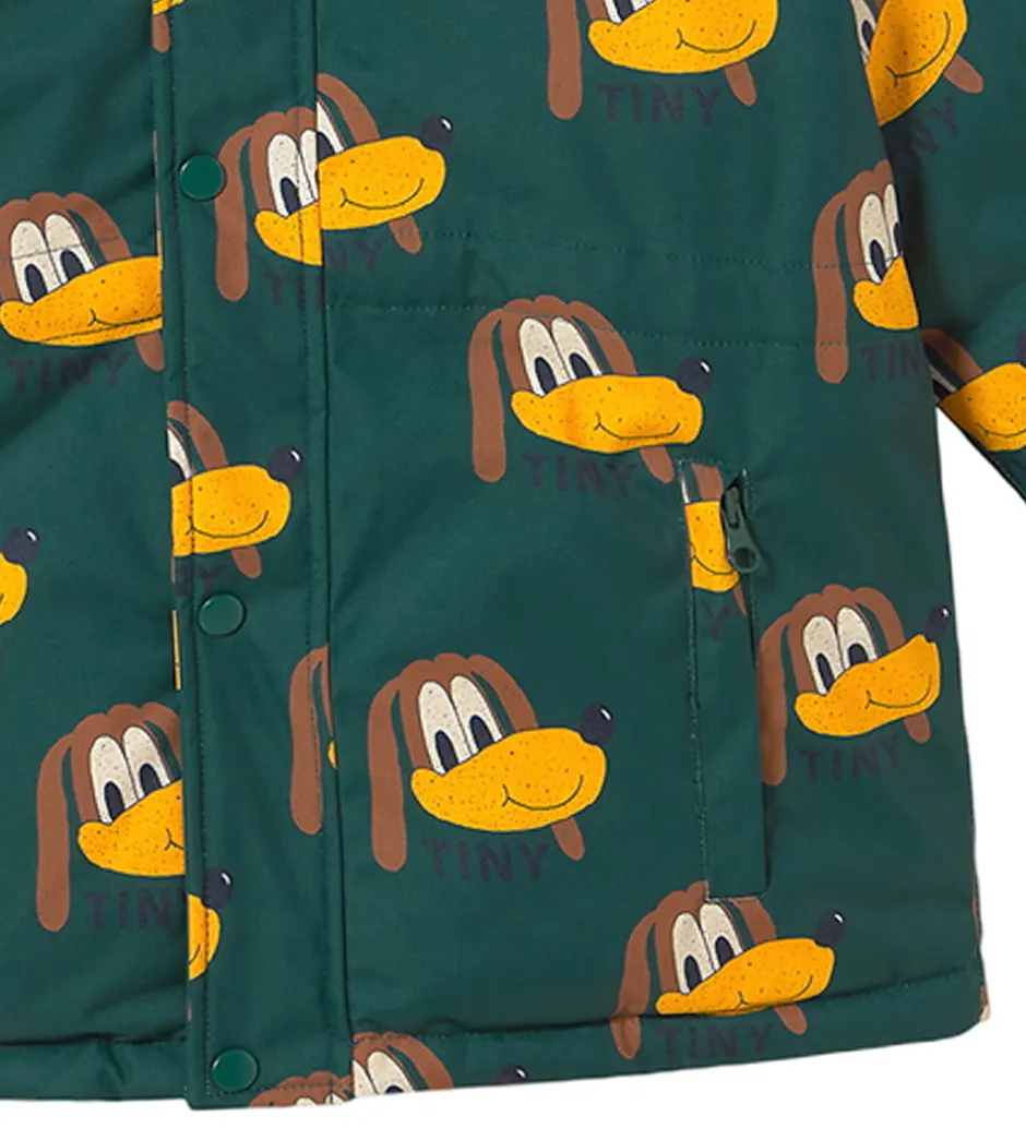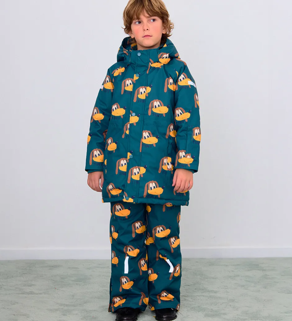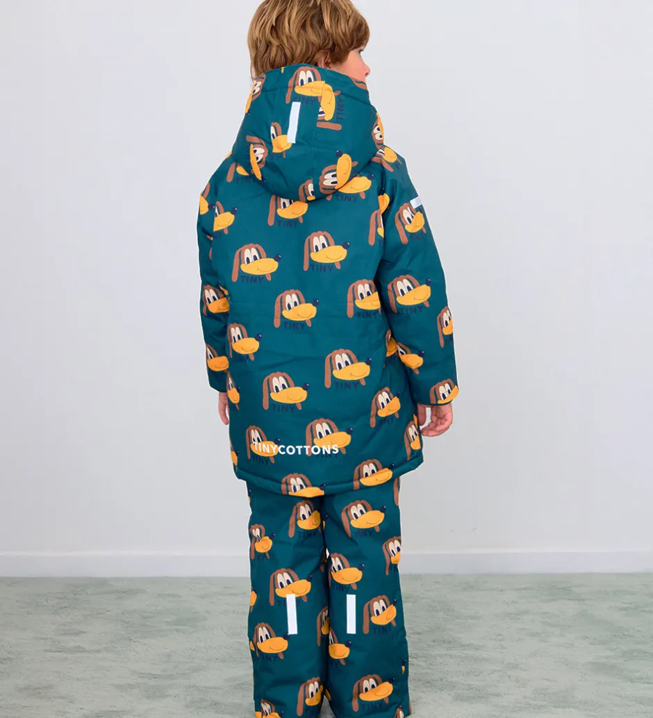 Flot Tiny Cottons vinterjakke i en petroleumsgrøn nuance med et charmerende hundeprint i gule og brune nuancer.