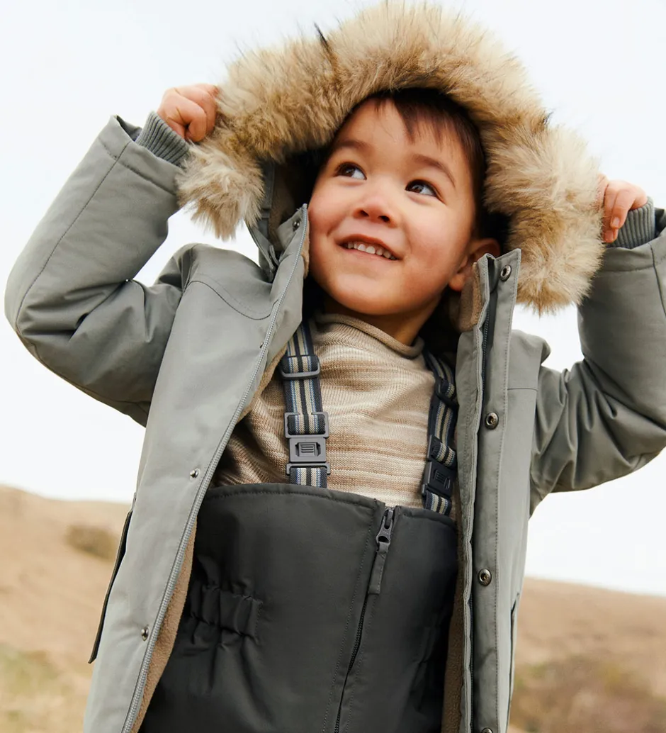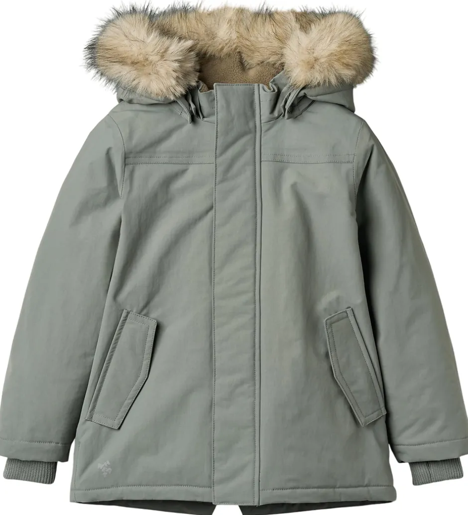 Skøn Wheat vinterjakke i grågrøn og med en flot kant af imiteret pels på hætten.