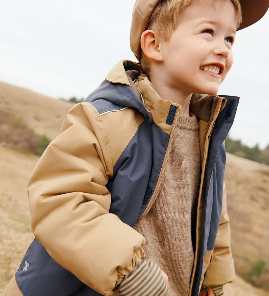 Fin Wheat vinterjakke i beige og gråblå og med velplacerede reflekslogoer og -detaljer.