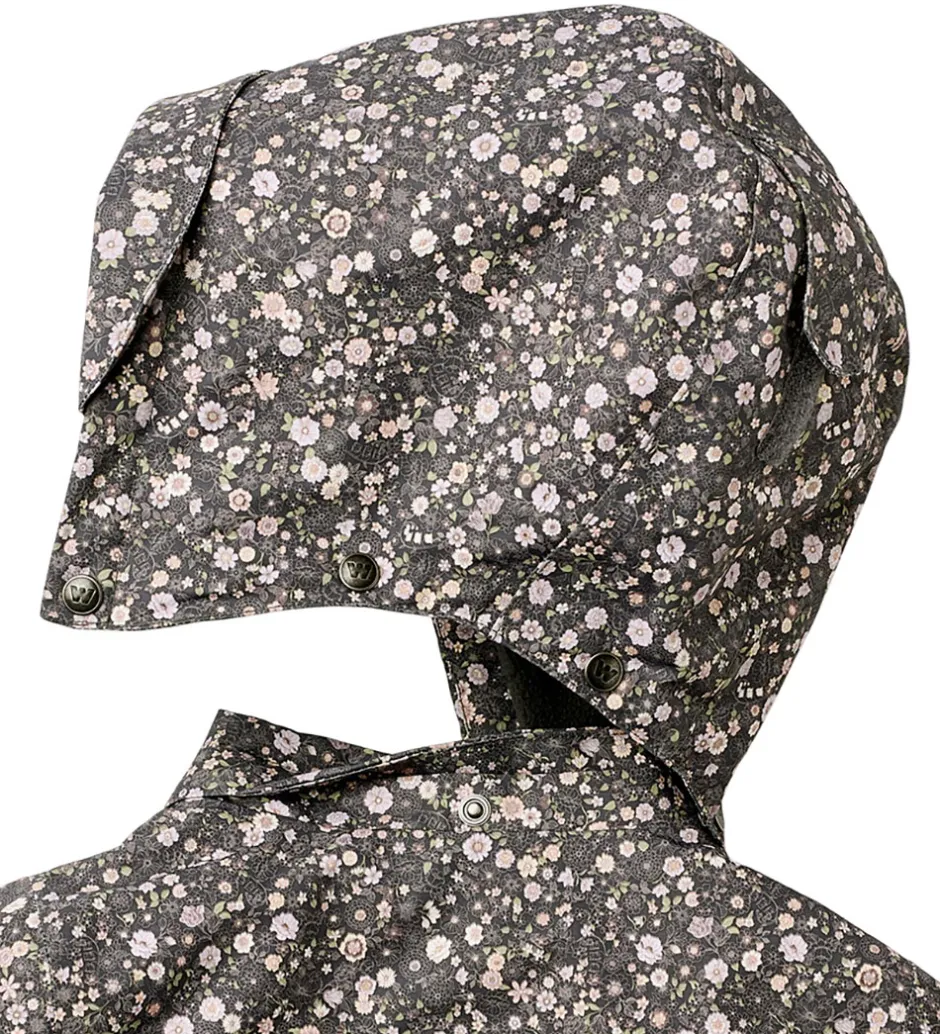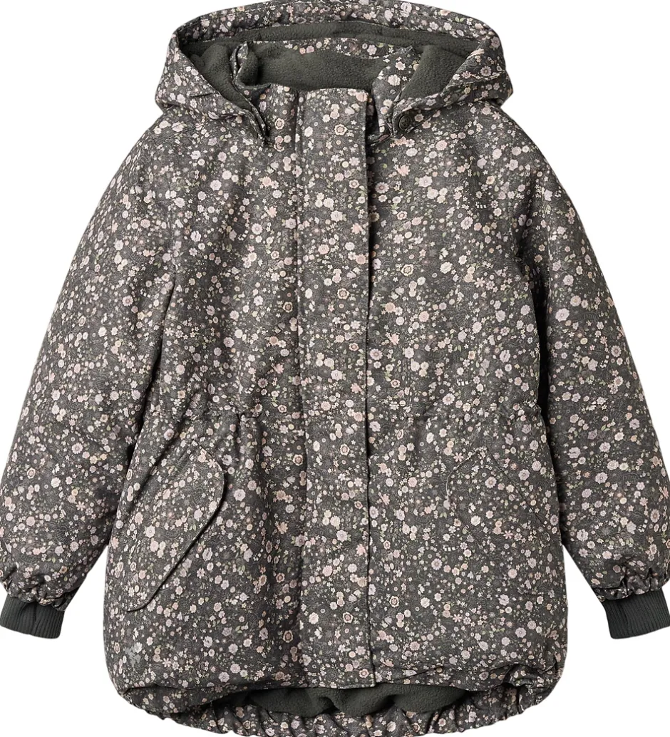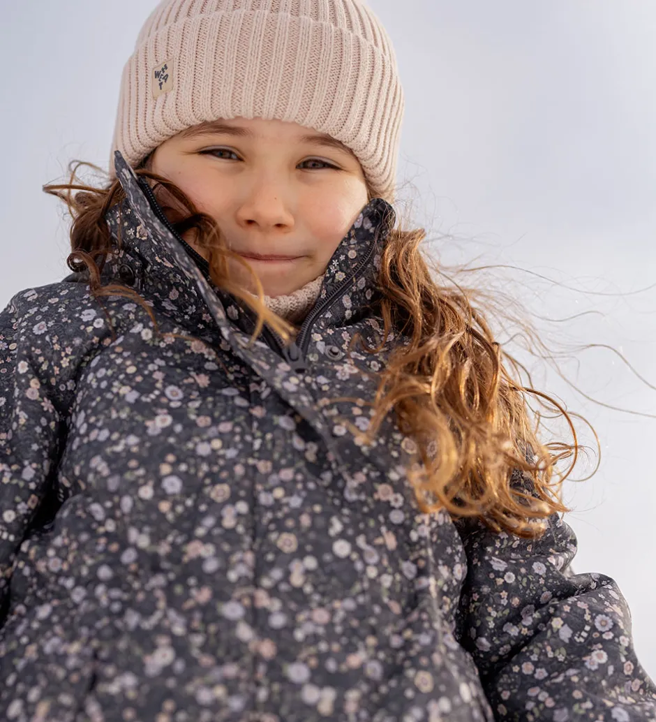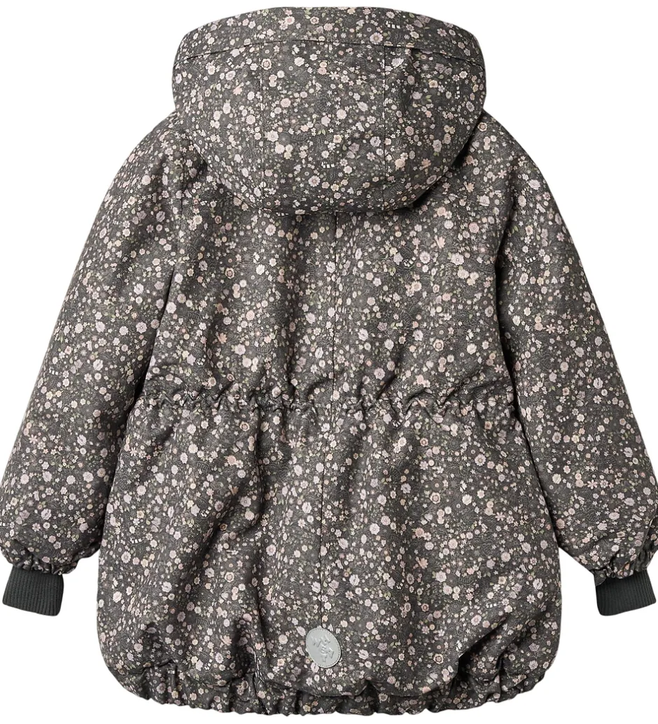 Dejlig Wheat vinterjakke i mørk koksgrå med et alloverblomsterprint i støvede lilla, rosa og grønne nuancer.